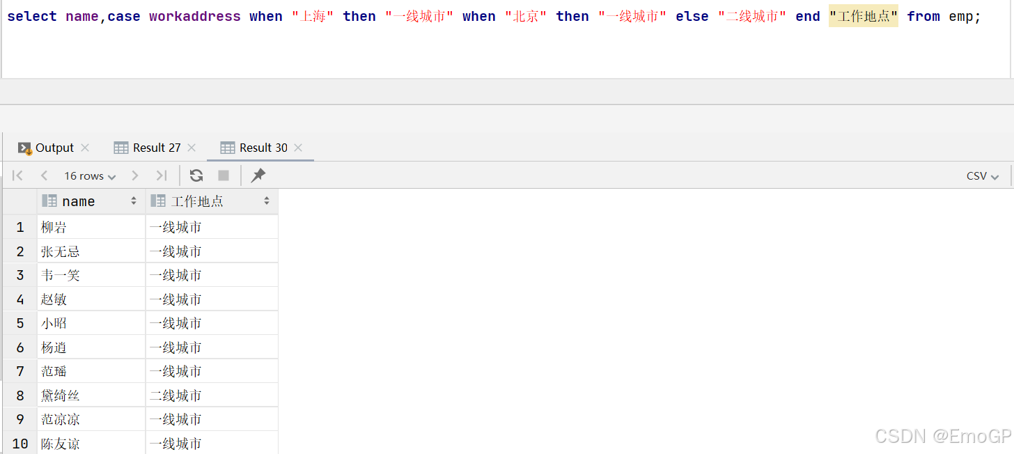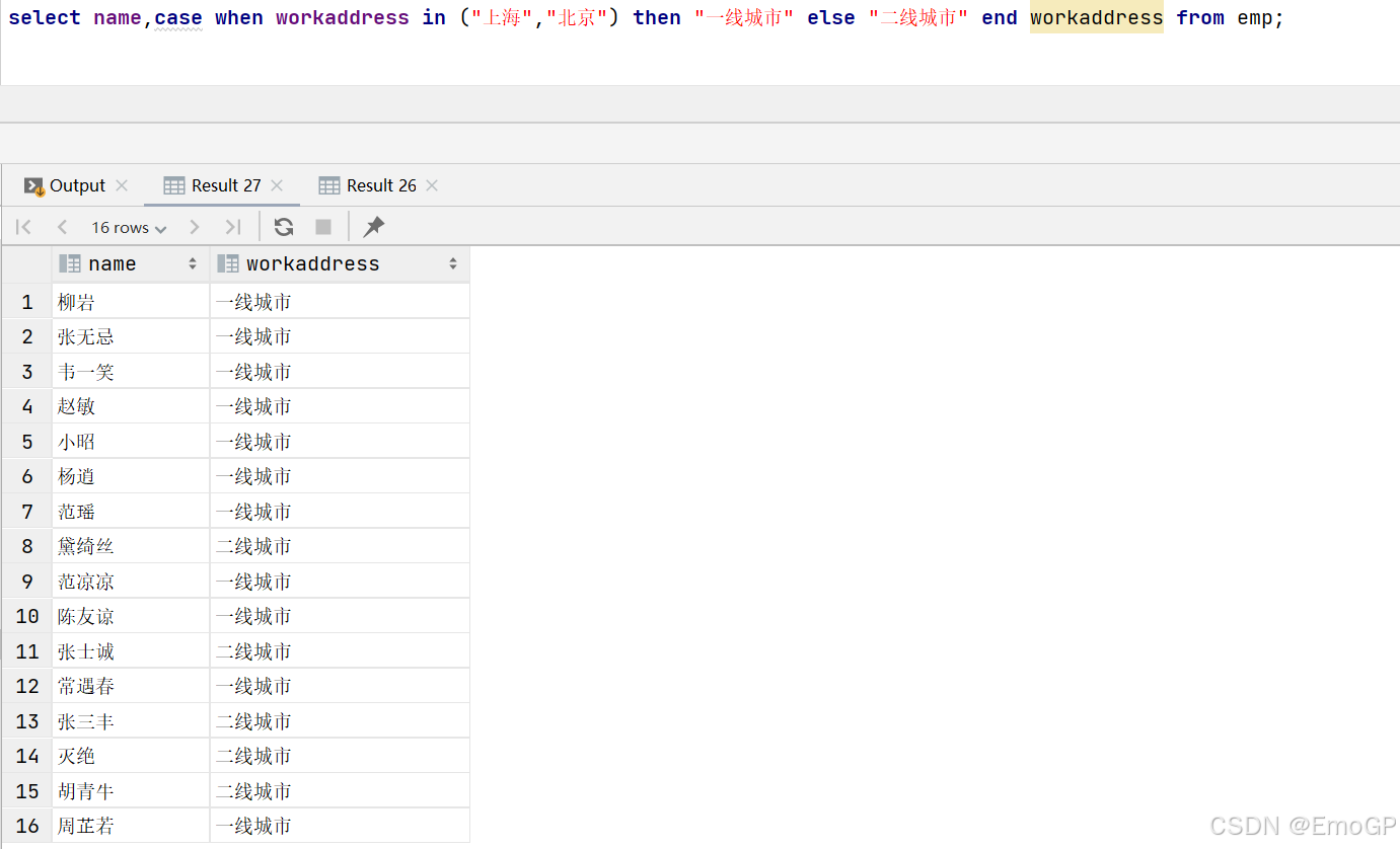 查询emp表的员工姓名和工作地址(北京/上海 ---> 一线城市,其他 ----> 二线城市)