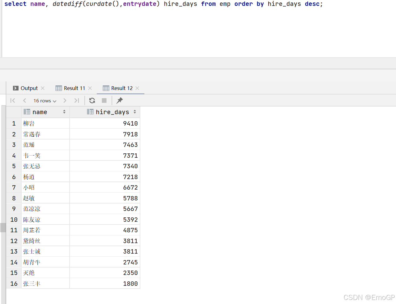 查询所有员工的入职天数,并根据入职天数倒序排序