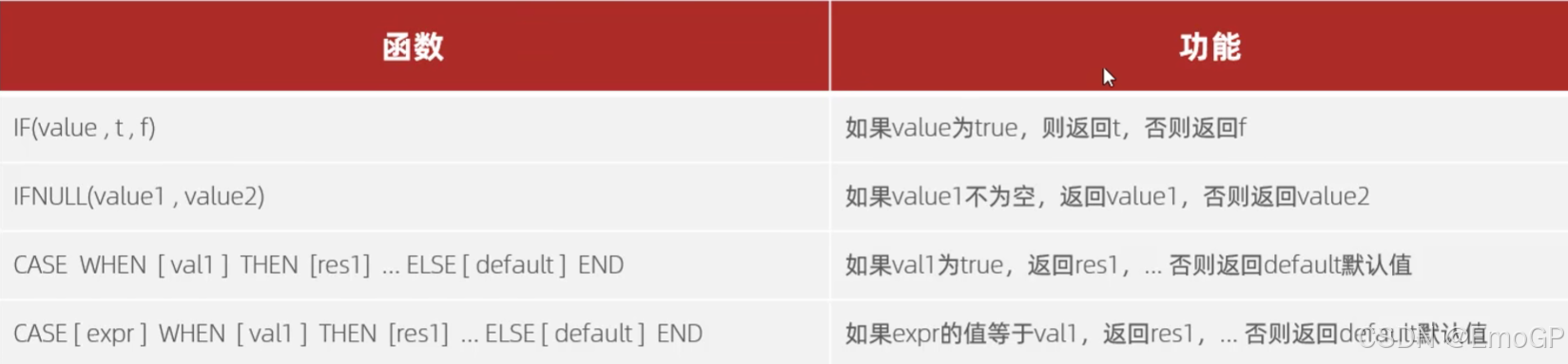 流程函数也是很常用的一类函数,可以在SQL语句中实现条件筛选,从而提高语句的效率
