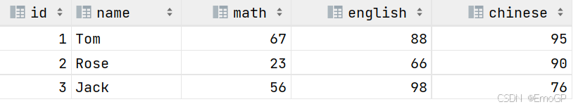 insert into score(id, name, math, english, chinese) VALUES (1, 'Tom', 67, 88, 95 ), (2, 'Rose' , 23, 66, 90),(3, 'Jack', 56, 98, 76);