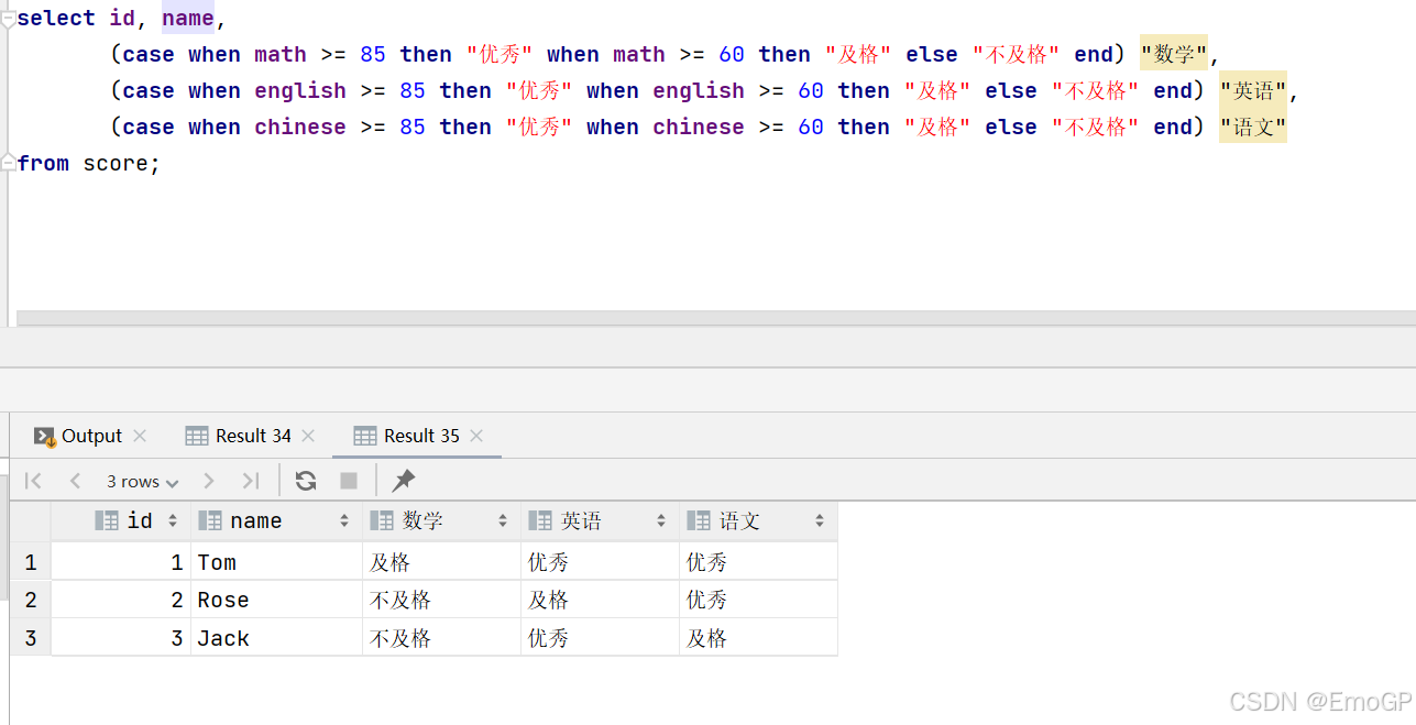 (case when math >= 85 then "优秀" when math >= 60 then "及格" else "不及格" end) "数学",