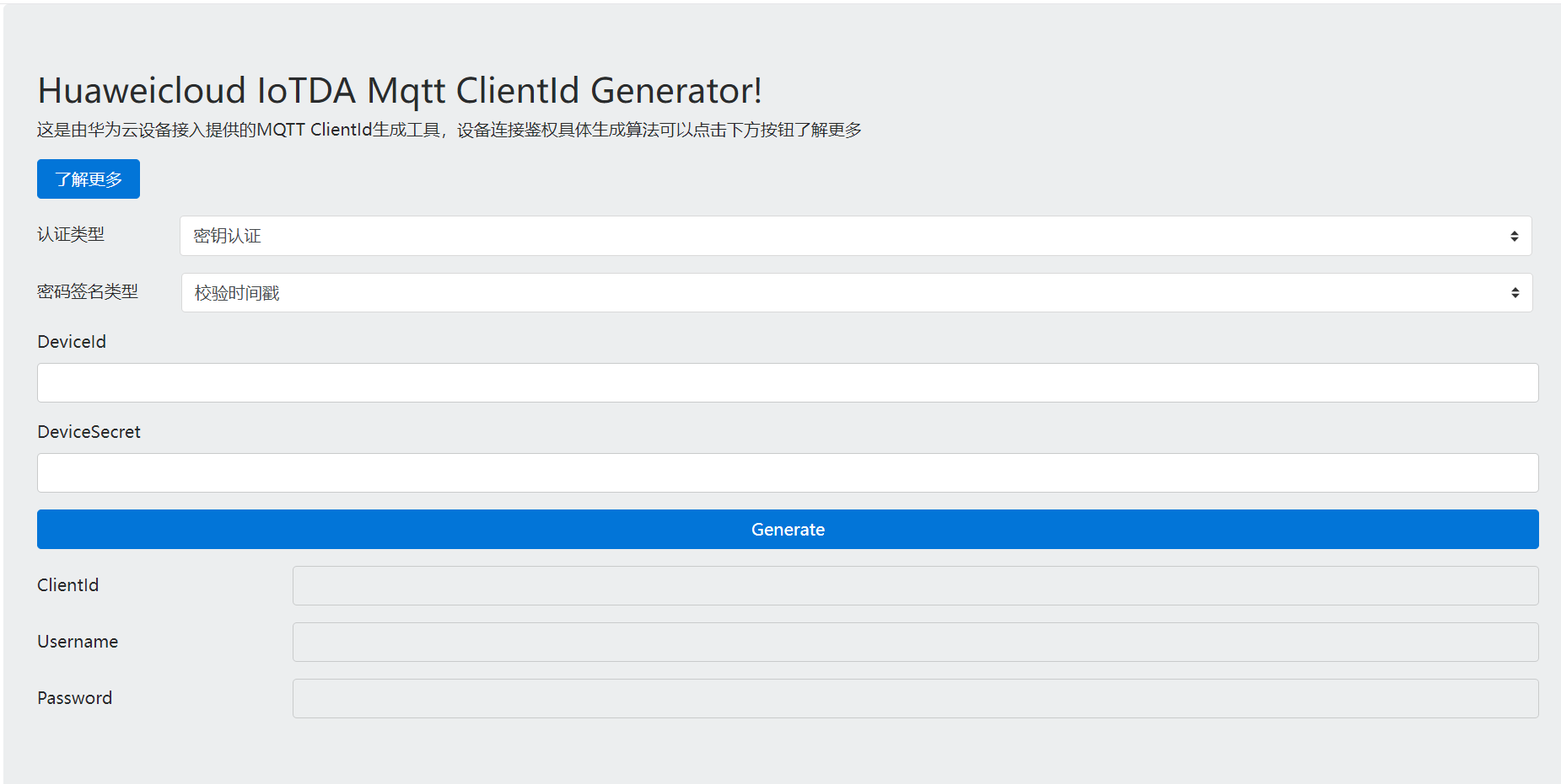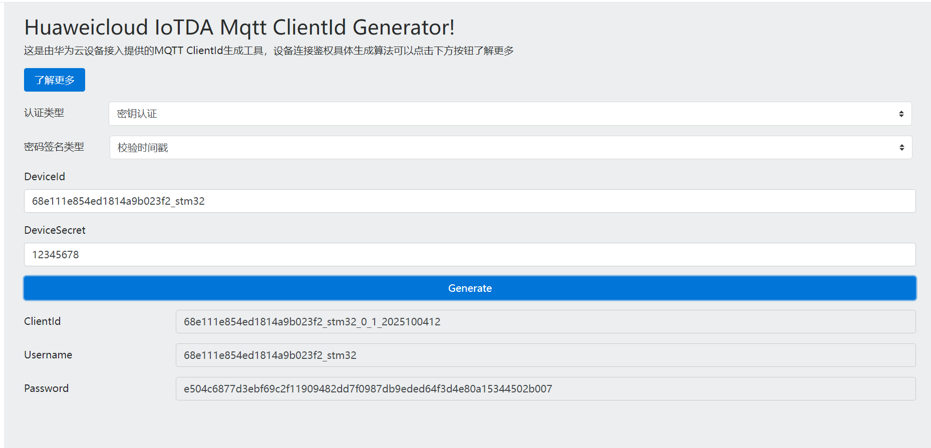 打开这个工具,填入设备的信息(也就是刚才创建完设备之后保存的信息),点击生成,就可以得到MQTT的登录信息了。