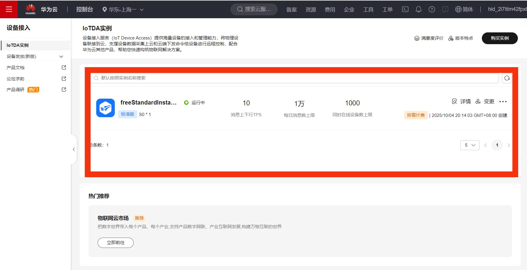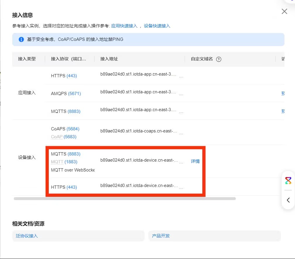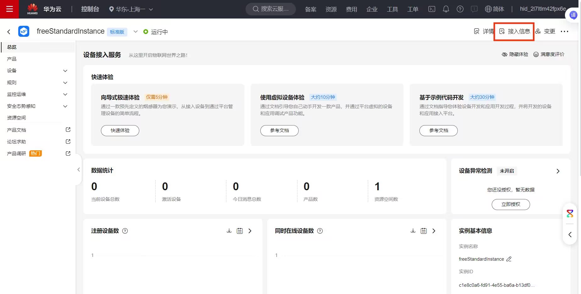进入实例详情页面后,可以看到接入信息的描述,我们当前设备准备采用MQTT协议接入华为云平台,这里可以看到MQTT协议的地址和端口号等信息。