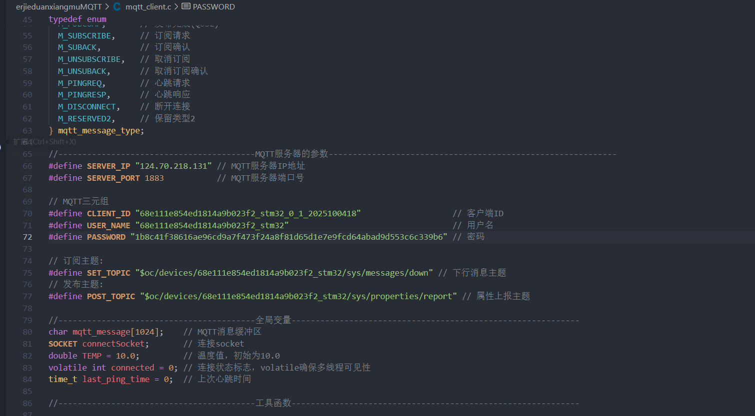 if (MQTT_Connect((char *)CLIENT_ID, (char *)USER_NAME, (char *)PASSWORD) != 0) // 连接MQTT服务器