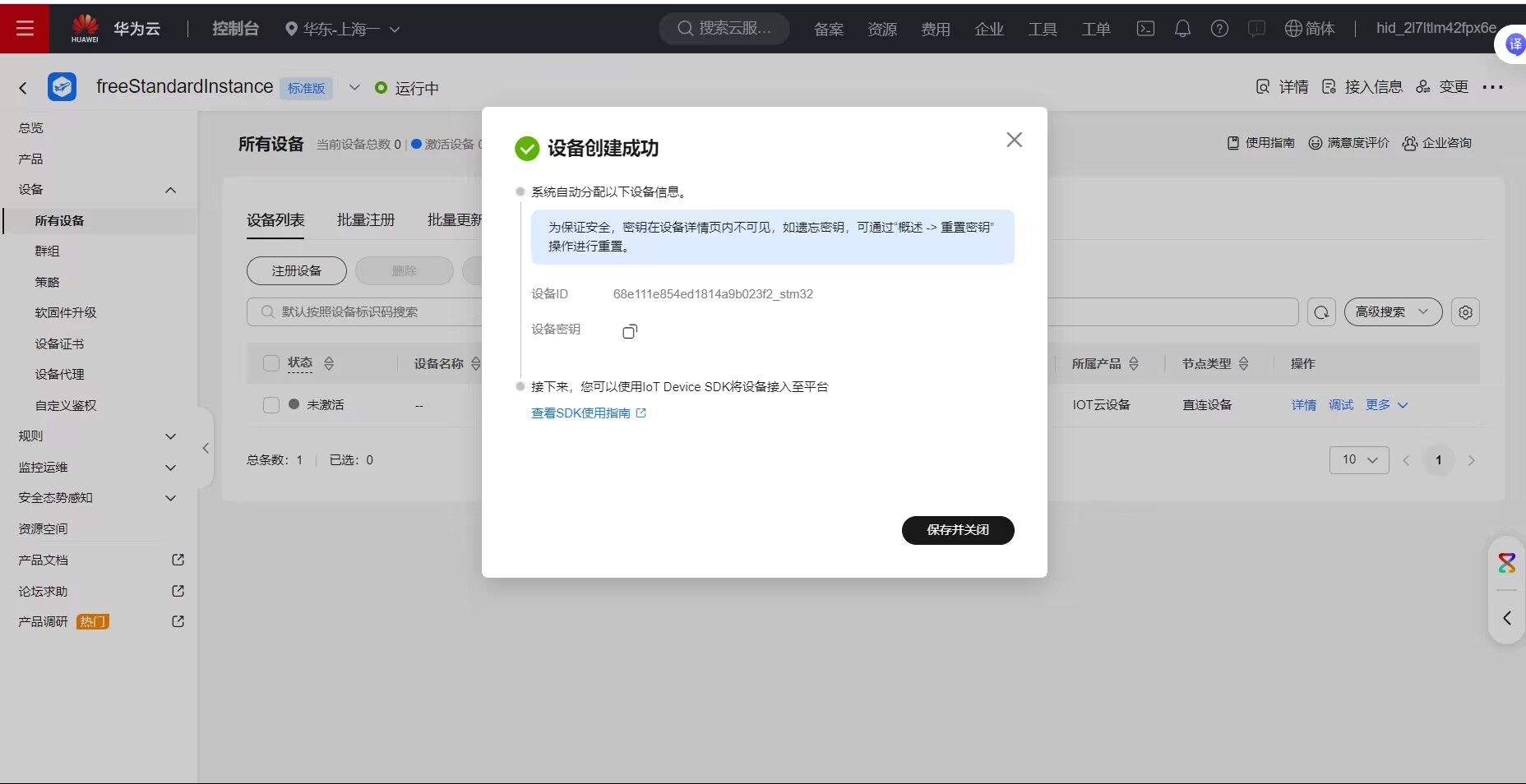 创建完毕之后,点击保存并关闭,得到创建的设备密匙信息。该信息在后续生成MQTT三元组的时候需要使用。
