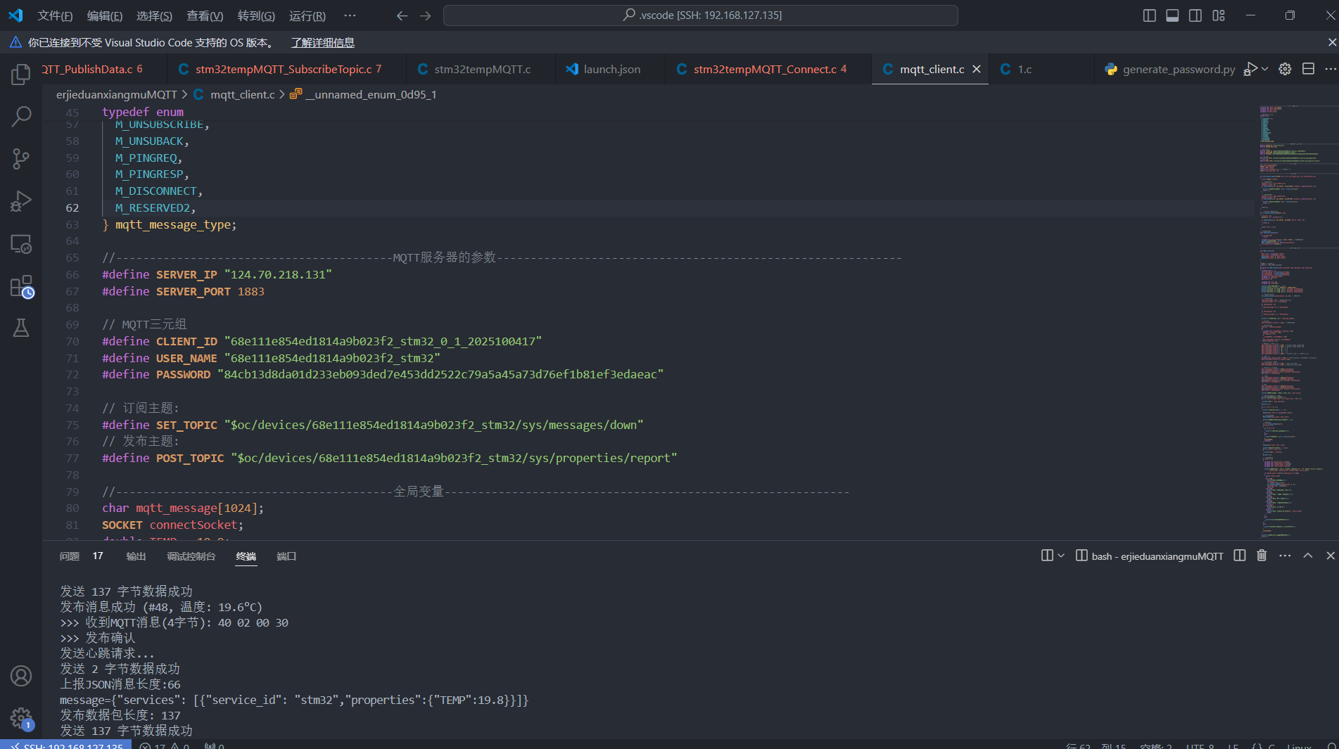 到此,云平台的部署已经完成,设备已经可以正常上传数据了。(注意:ClientId和Password是实时更新变化的,每次链接需要重新获取)