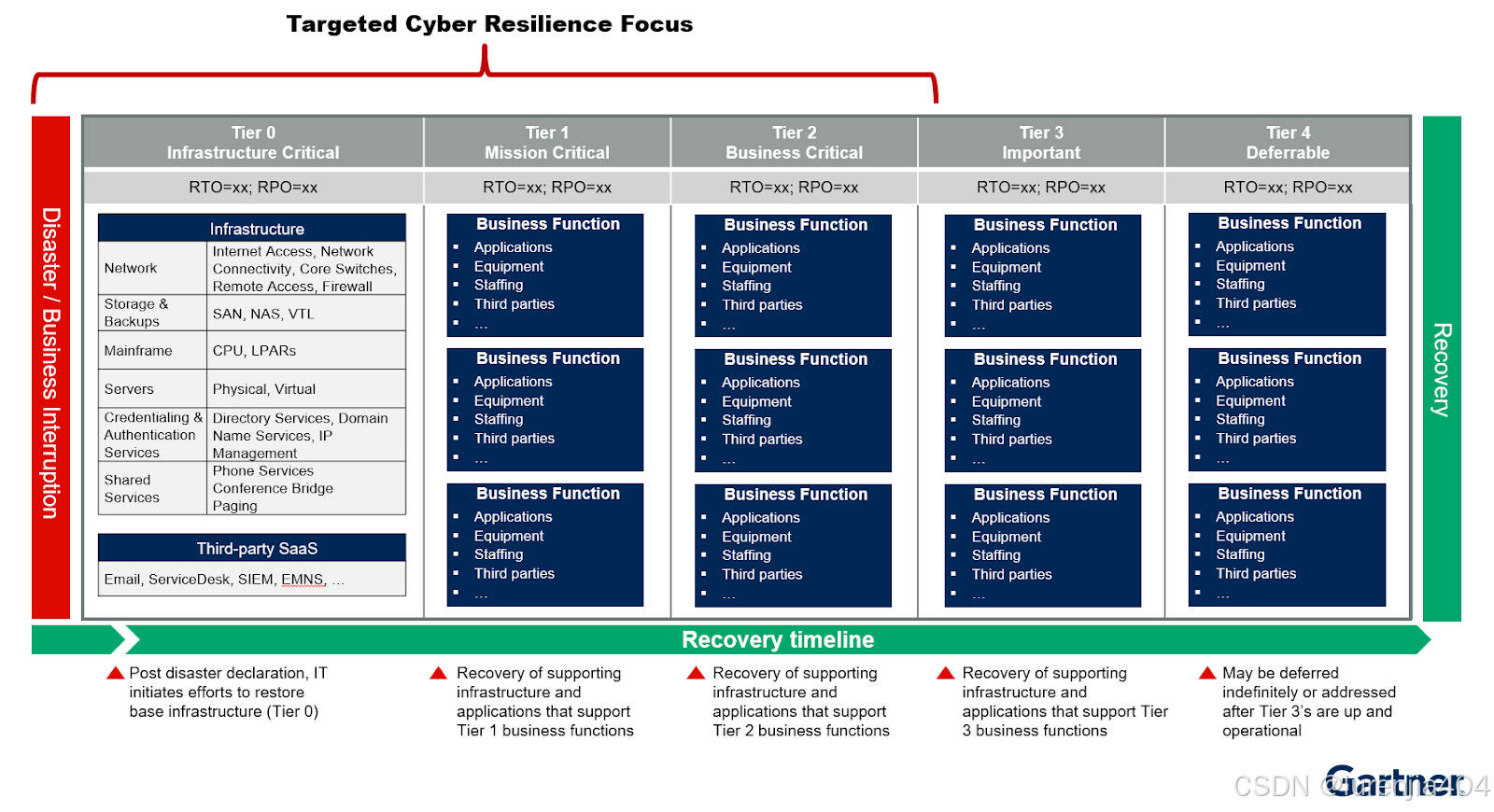网络安全领导者必须将基于风险的多层次测试程序制度化,并将其作为其弹性战略中不可或缺的要素。测试不应局限于合规性复选框,而应成为与业务影响分析 (BIA)、恢复时间目标 (RTO) 和恢复点目标 (RPO) 相一致的战略性迭代流程,从而推动持续改进和运营准备就绪。测试应侧重于满足关键系统的恢复时间和恢复点要求,并在可行的情况下将关键第三方纳入测试流程。Gartner 发现,每年使用桌面场景测试的组织中,只有不到 46% 的组织仅测试了不到 20% 的业务连续性计划。请记住,如果发生勒索软件等重大事件,组织可能无法实现计划中概述的恢复时间目标 (RTO) 和恢复点目标 (RPO)。然而,全面且持续的测试应该有助于缓解或应对您在做好更充分准备后可能遇到的一些挑战。