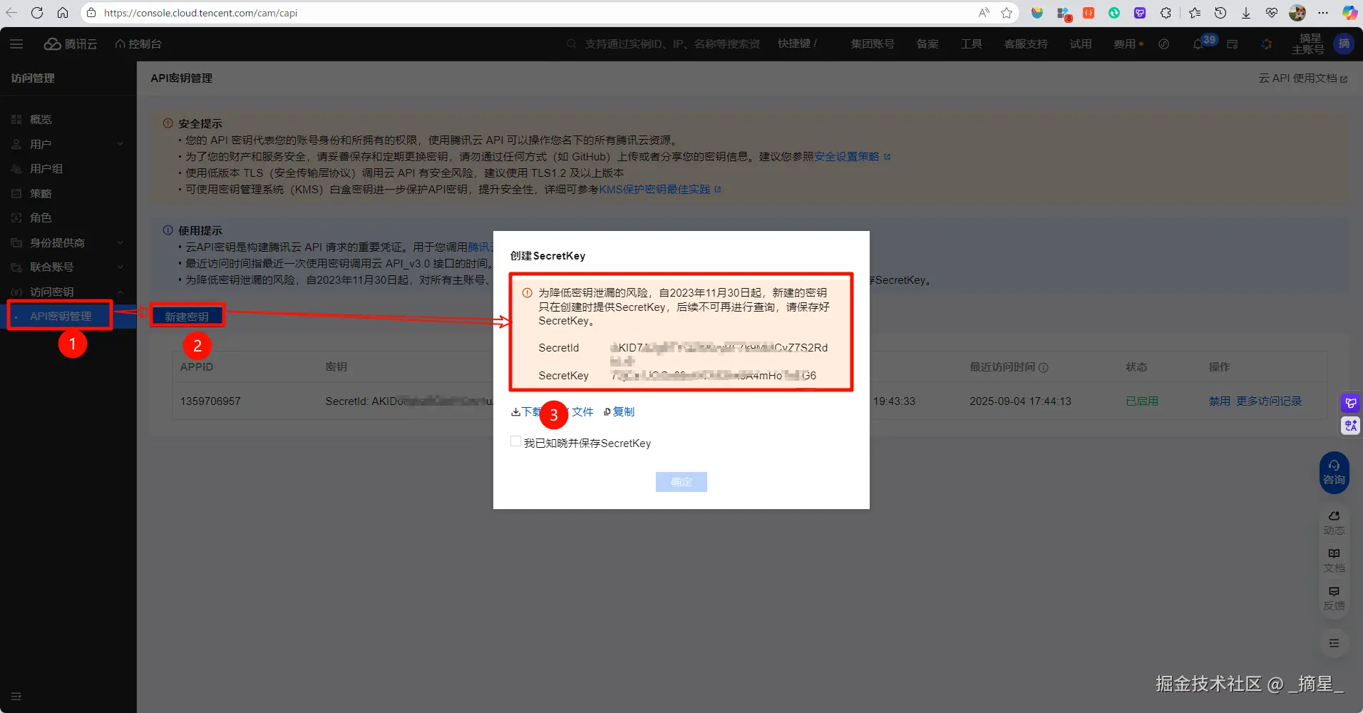 进入到腾讯云控制台中的API密钥管理界面[https://console.cloud.tencent.com/cam/capi\](https://console.cloud.tencent.com/cam/capi),如下图所示开通腾讯原API密钥