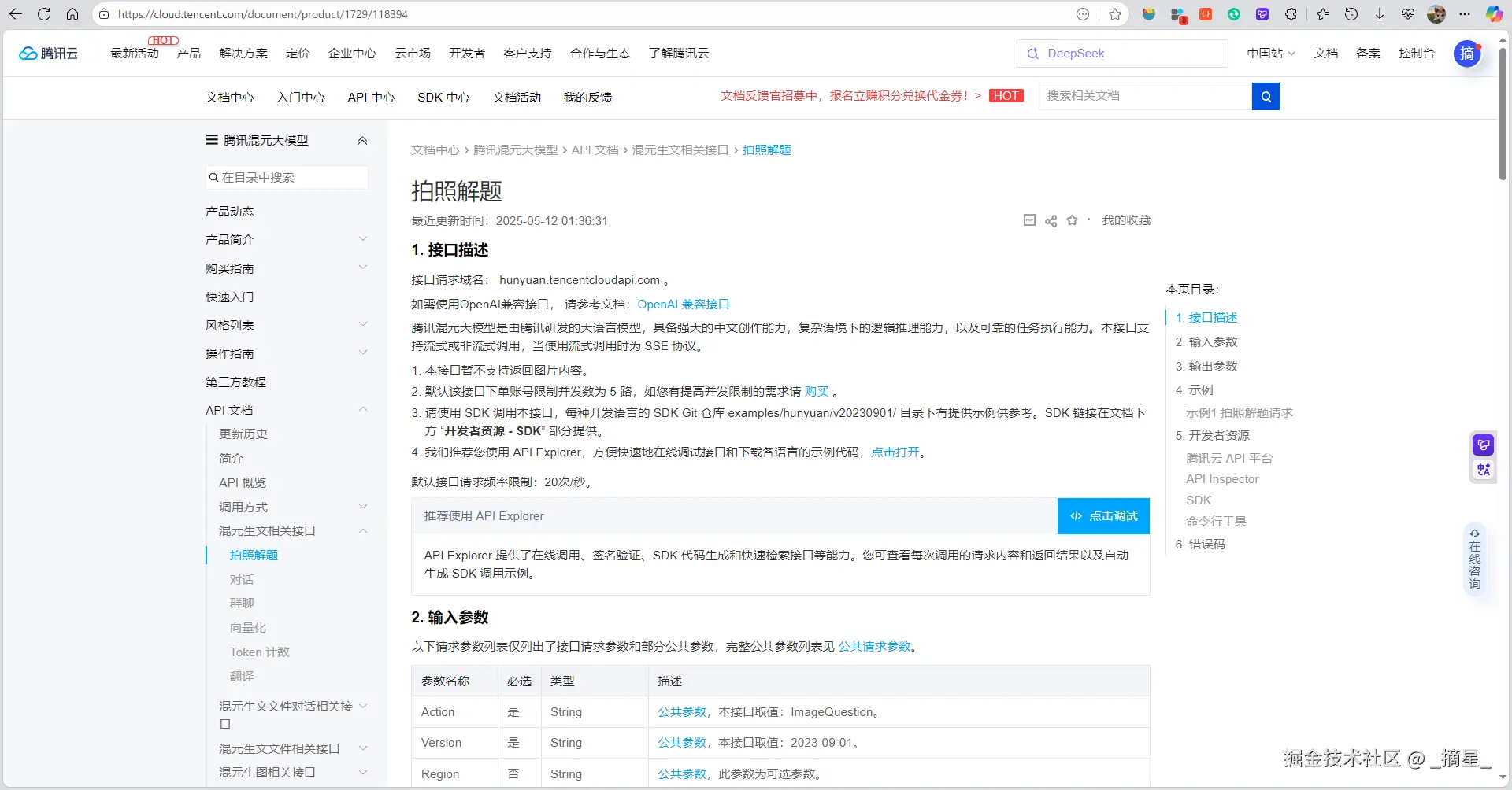 我这里开发主要是采用的腾讯混元API方式接入的,参考的是官方文的API文档,有兴趣的小伙伴也可以去尝试一下[https://cloud.tencent.com/document/product/1729/101848\](https://cloud.tencent.com/document/product/1729/101848):