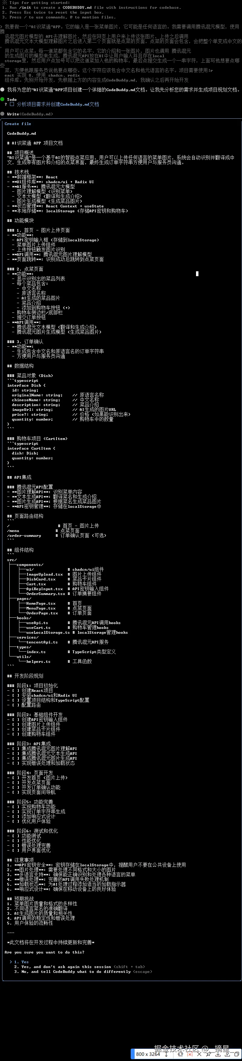 可以看到CodeBuddy已经开始分析并且对照文档进行开发了,并且CodeBuddy的每一步操作都会询问,这里如果不想一直被询问的话可以选择第二个选项,这里我就直接让CodeBuddy全速开发了,接下来就是等待即可,由于篇幅原因我就直接跳到最后一步看成果了。