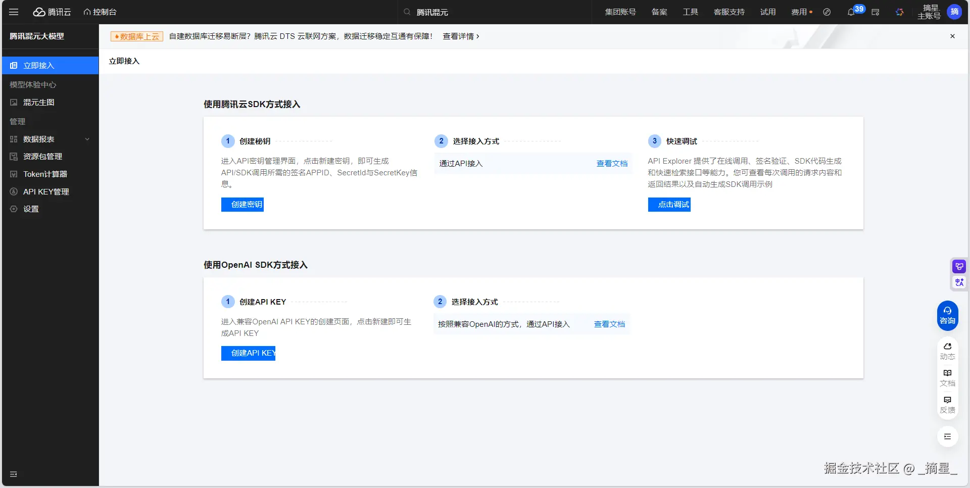 访问腾讯云控制台中的腾讯混元大模型[https://console.cloud.tencent.com/hunyuan/start\](https://console.cloud.tencent.com/hunyuan/start),点击立即开通,开通之后就如下图所示: