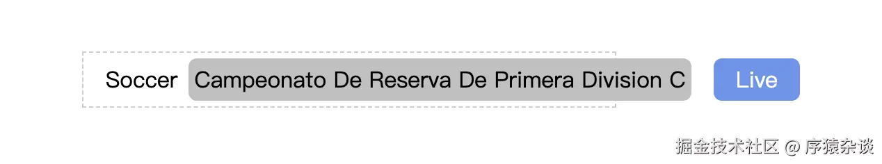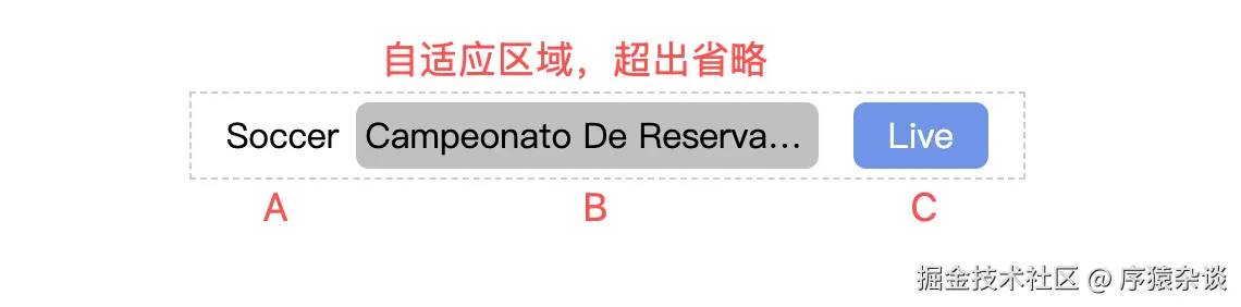 在开发中,我们常遇到这种布局:A、B、C 三段文本长度不固定,其中 A、C 占用空间较少,需要完整显示;而 B 是自适应区域,超出部分需省略显示。A 与 B 共享同一容器,右侧的 "Live" 按钮与该容器同级,容器应占据除 "Live" 之外的所有剩余空间。