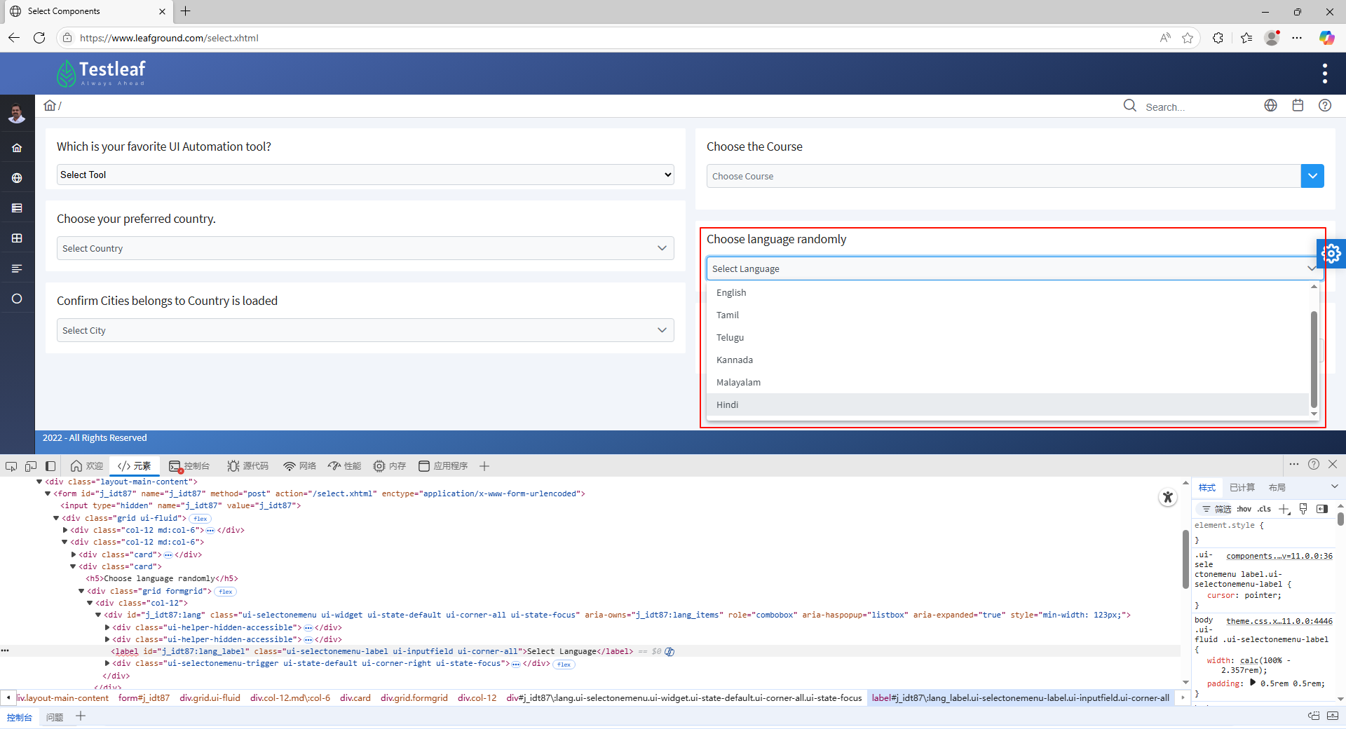 8、以测试网站 https://www.leafground.com/select.xhtml 页面中的 下拉菜单多选项为例,打开下拉选择框,要选择最后一个,刚开始打开下拉框时是选不到最后一个选项的,需要滚动向下才能看到最后一个选项;