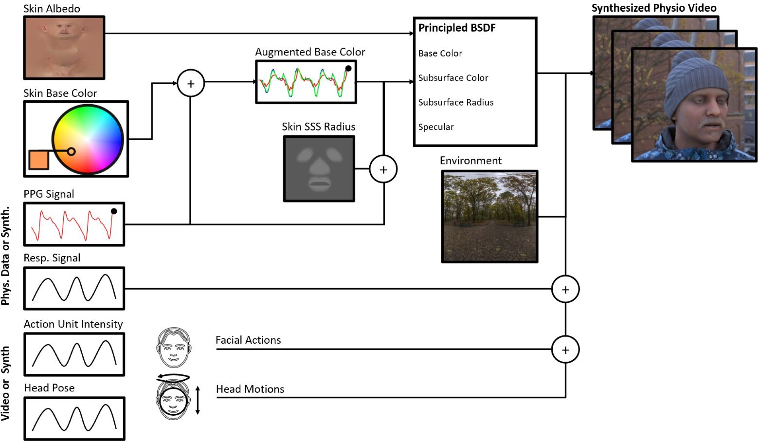 SCAMPS 数据集是通过计算机图形学 + 生理模拟管线生成的。其关键技术点包括: