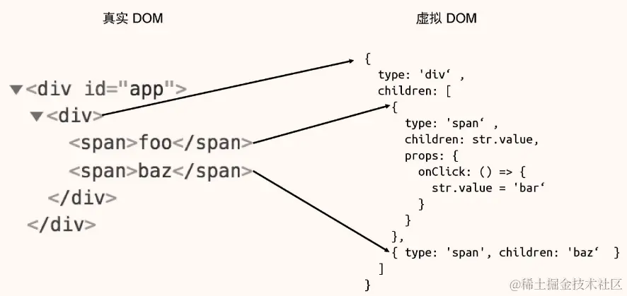在具体实现其函数之前,我们先来看一下页面中已经存在的真实 DOM 元素与虚拟 DOM 对象之间的关系,如下图:
