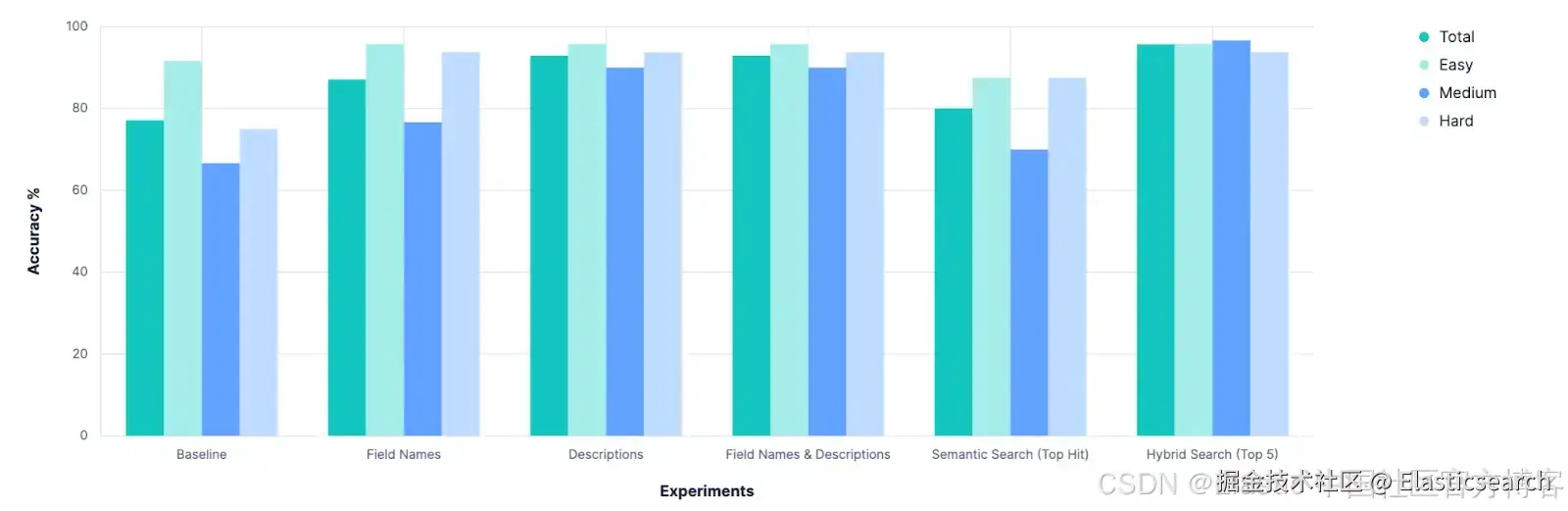 数据给出的答案是 "不"(与上一次实验相比没有变化)。这里的主要理论是,由于描述最初就是从索引字段/mapping 生成的,当将它们组合时,这两部分上下文之间没有足够不同的信息来增加任何 "新" 的内容。此外,我们为 20 个测试索引发送的负载已经相当大。到目前为止的思路不可扩展。事实上,有充分理由相信,到目前为止的任何实验,在有数百或数千个索引可供选择的 Elasticsearch 集群上都不会有效。随着索引总数增加而线性增加发送给 LLM 的消息大小的任何方法,可能都不是通用策略。