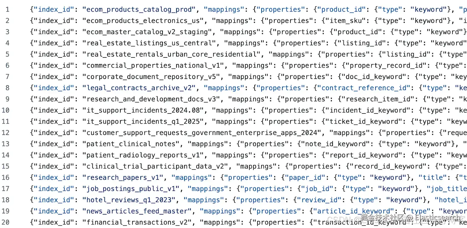 工具的最初作者已经预料到这一点。虽然索引的 mapping 是信息的宝库,但它也是一个相当冗长的 JSON 块。在现实场景中,当你需要比较大量索引(我们的评估数据集定义了 20 个索引)时,这些 JSON 块会累积起来。因此,我们希望给 LLM 提供比仅索引名称更多的上下文,但又不要像每个索引的完整 mapping 那样庞大。