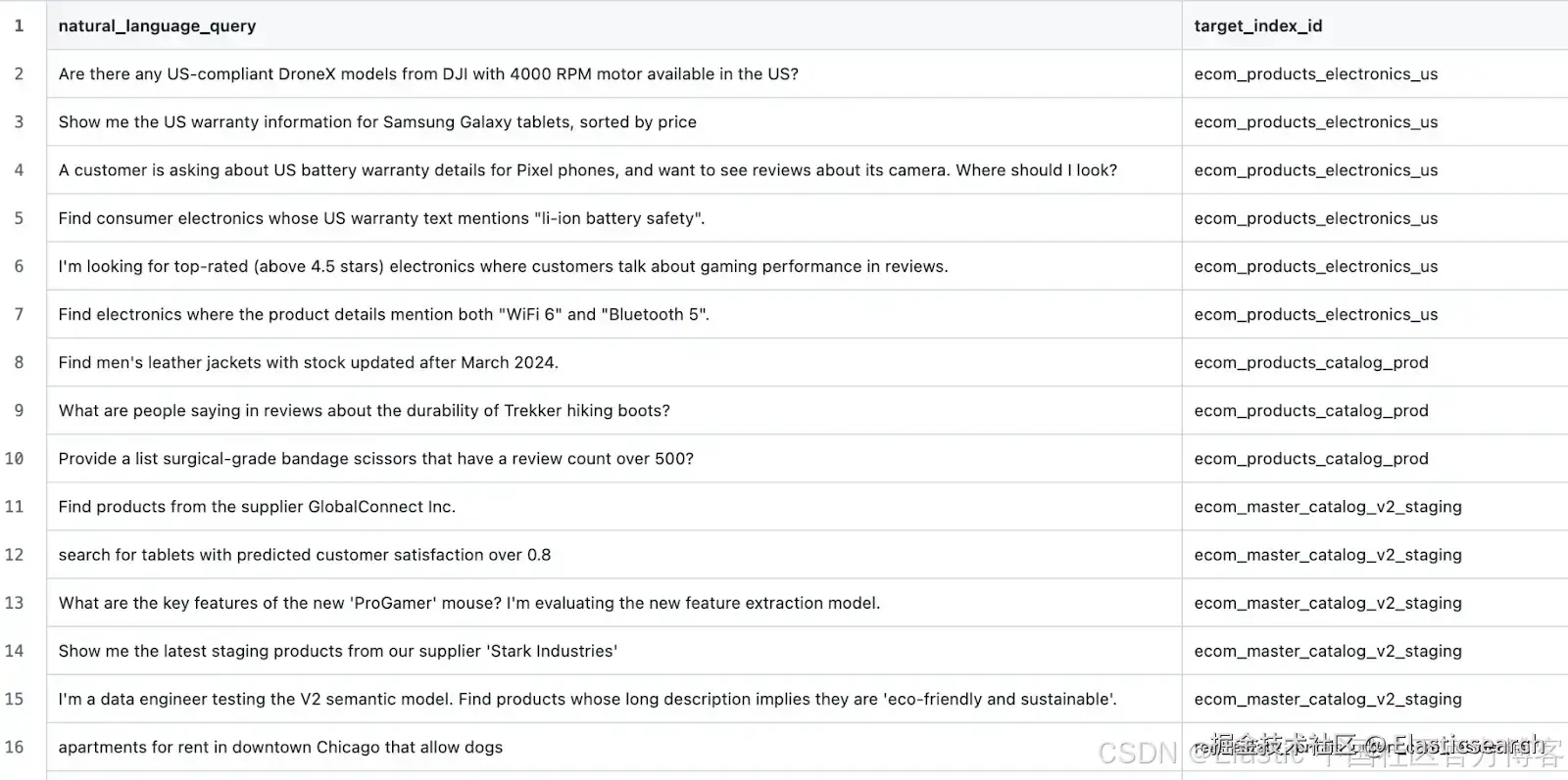 我们使用这个提示为几个不同的领域生成了种子索引。然后,对于每个生成的领域,我们又使用这个提示生成了更多索引(目的是通过困难的负样本和难以分类的示例来增加 LLM 的混淆)。接着,我们手动编辑了每个生成的索引及其描述。最后,我们使用这个提示生成了测试查询。这样,我们就得到了如下的示例数据: