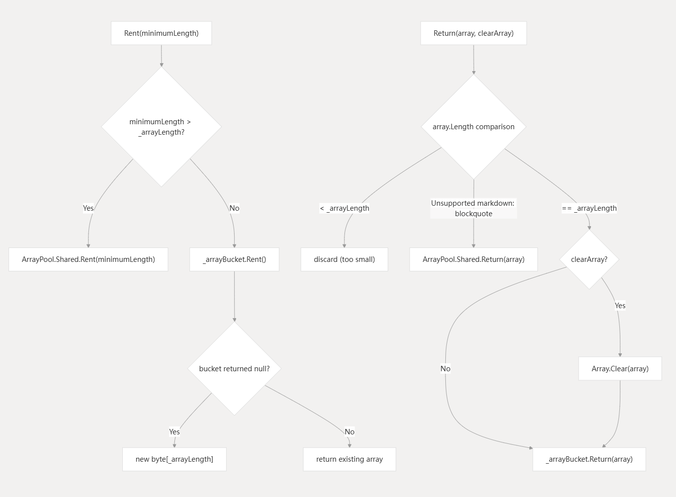 ByteArrayPool 根据请求的最小长度实现双路径分配策略,正常情况下都使用自维护的ByteArrayBucket,意外情况下转为使用ArrayPool<byte>.Shared
