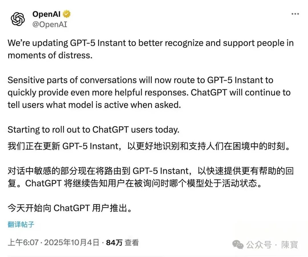 当全球数亿用户已经习惯向AI倾诉心声、寻求安慰时,GPT-5却因过于理性、缺乏情感温度而引发广泛不满。短短两个月后,OpenAI带来了修复这一问题的GPT-5 Instant模型,专门用于识别和安抚情绪低落的用户。