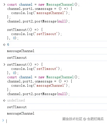 - messageChannel和setTimeout在浏览器端没有优先级顺序,谁先进入宏任务队列,谁先执行