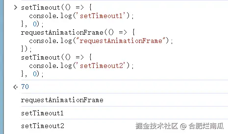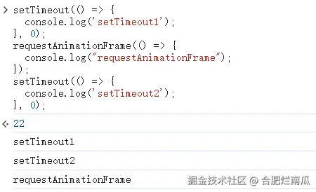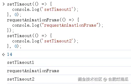 - 如果当前是requestAnimationFrame阶段,那么会先输入rAF,再下一帧输出setTimeout1和setTimeout2