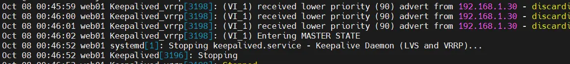 - 当主节点停止心跳时,备节点自动接管 VIP。