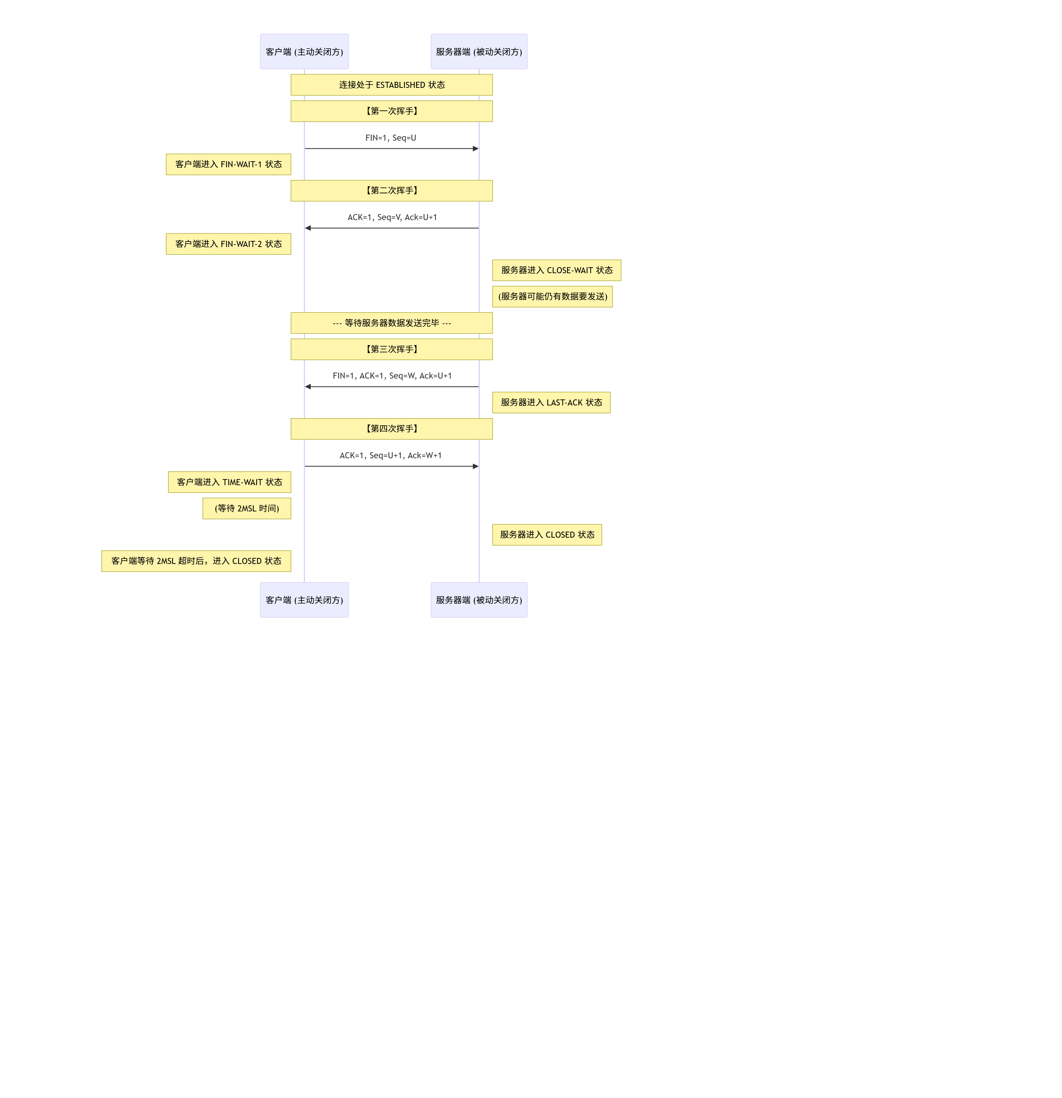 客户端发送完 ACK 后,进入 TIME-WAIT 状态,等待 2MSL (Maximum Segment Lifetime,报文最大生存时间,通常为 2 分钟) 后,连接彻底关闭,进入 CLOSED 状态。