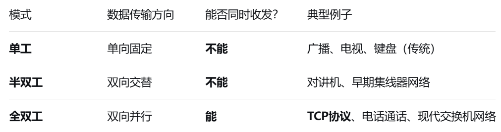 核心概念 : 数据传输是双向 的,但不能同时进行。在同一时刻,只能有一方发送,另一方接收。它像一条单车道的桥,车流可以双向通行,但同一时间只能有一个方向的车辆通过。