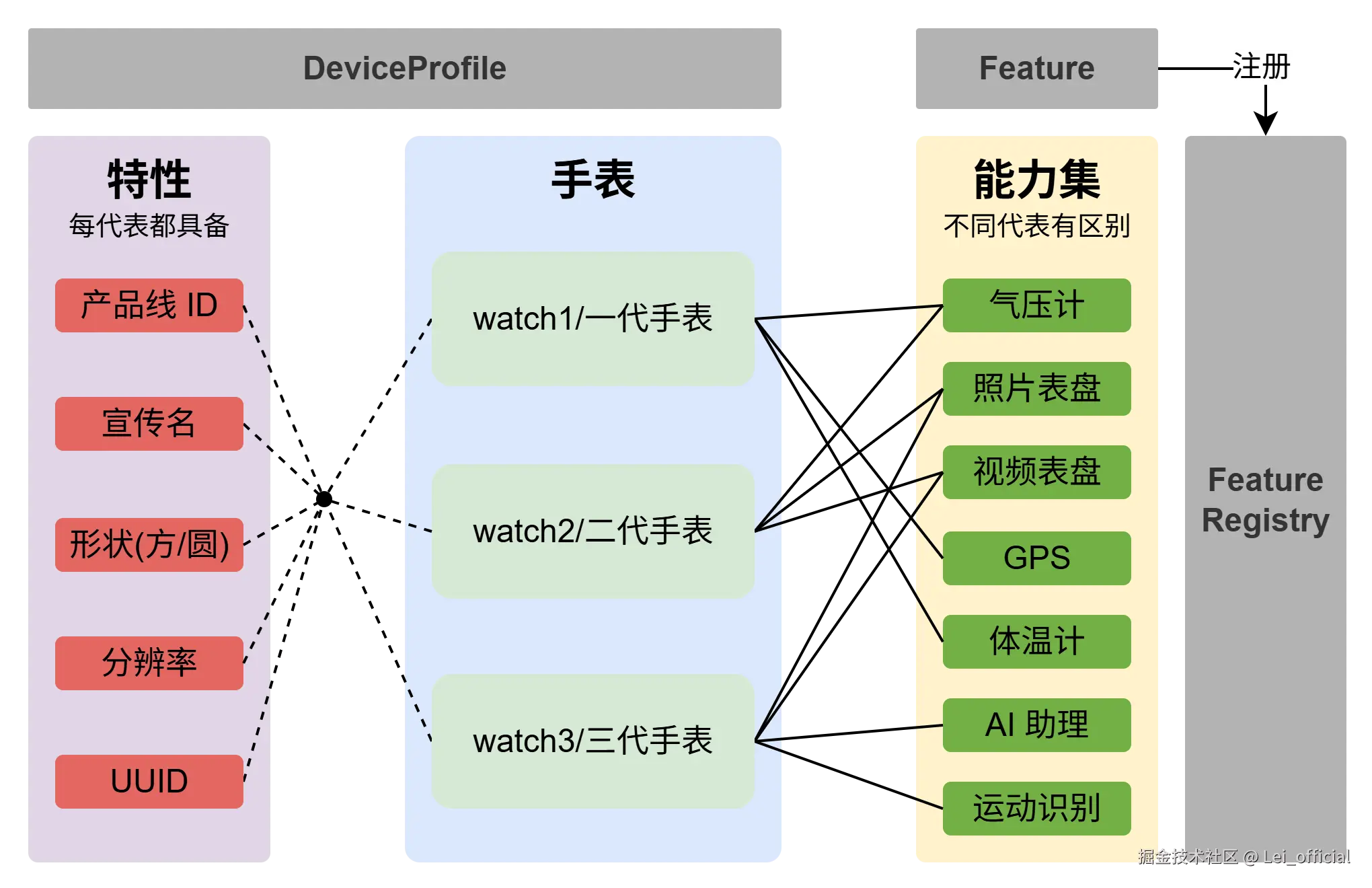 决定启用哪些功能模块、使用哪种模板)。 - 以表盘功能为核心------这项功能用在哪代手表上 (例如每个功能模块自己声明支持哪些设备特征,然后由系统去匹配组合)。