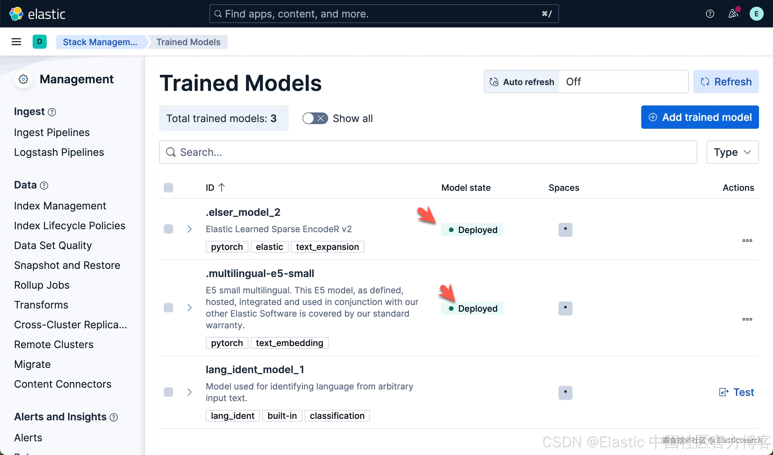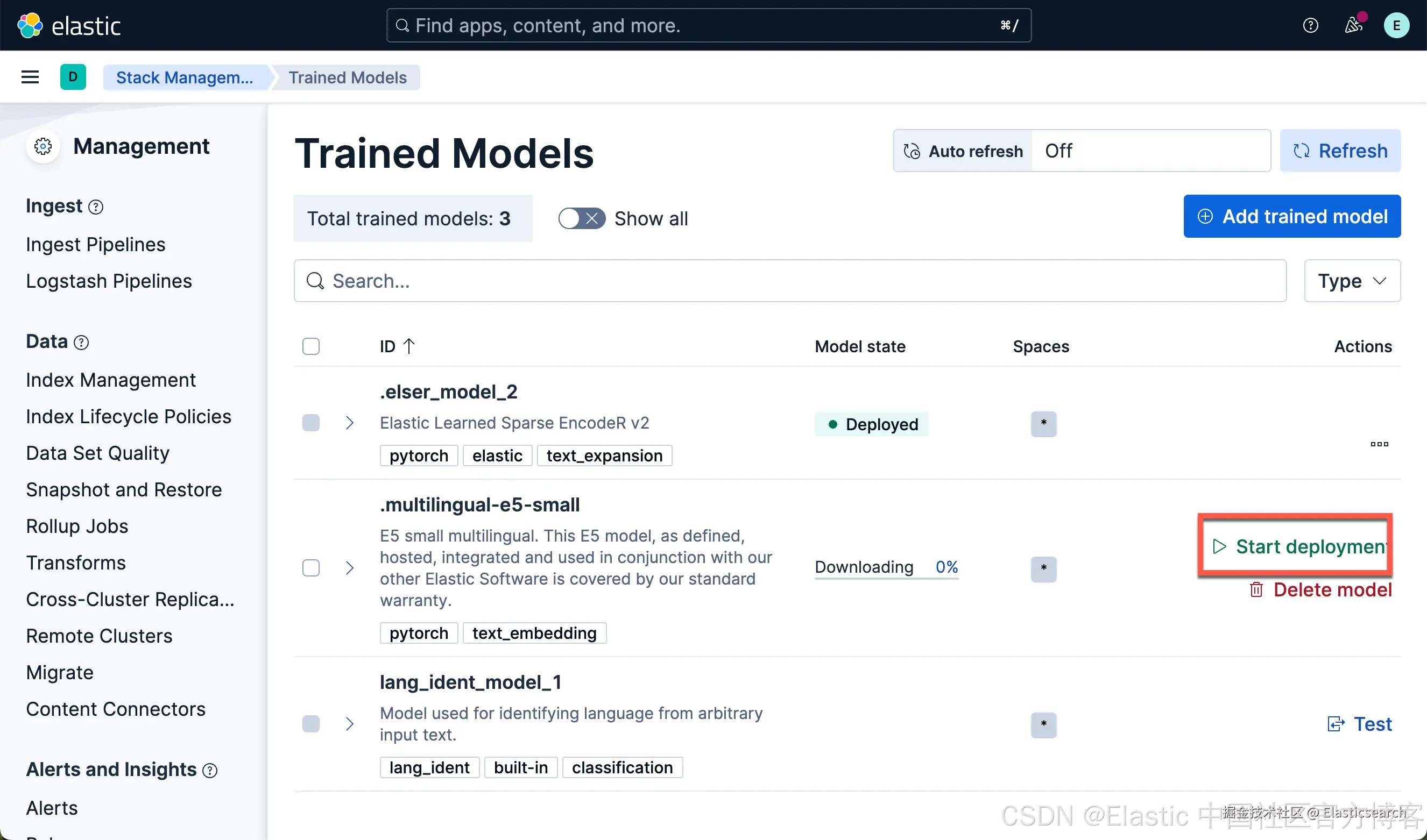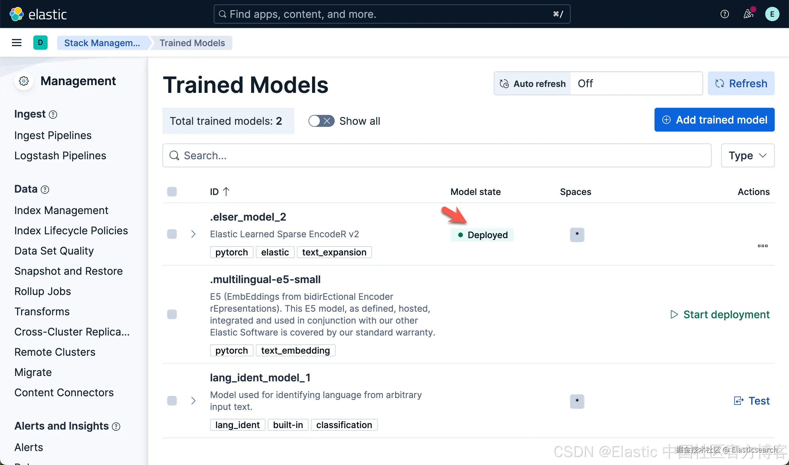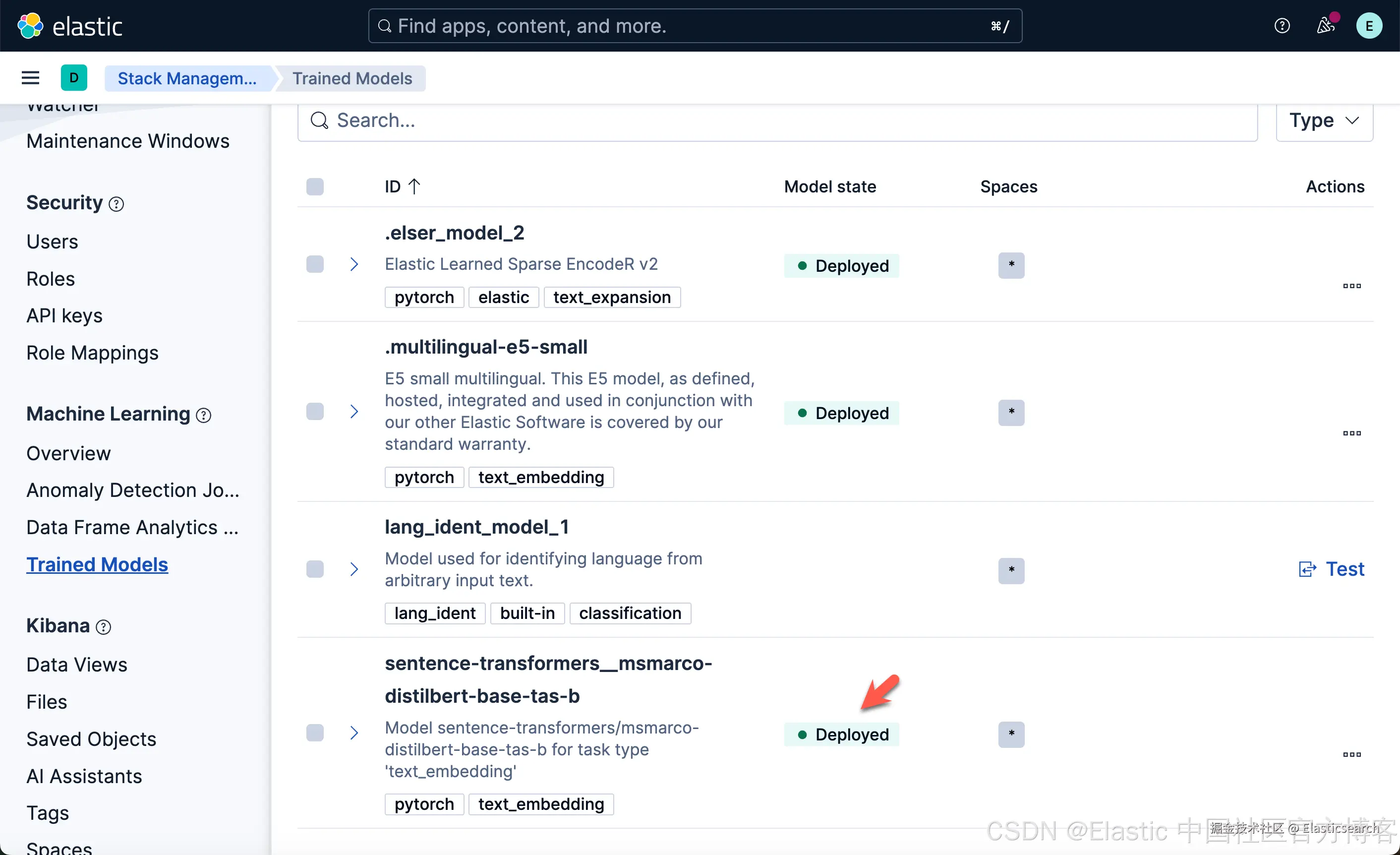 我们可以看到上面的两个模型都已经部署好了。如果你想部署其它的模型,可以参考文章 "Elasticsearch:如何部署 NLP:文本嵌入和向量搜索" 使用 eland 来上传模型。