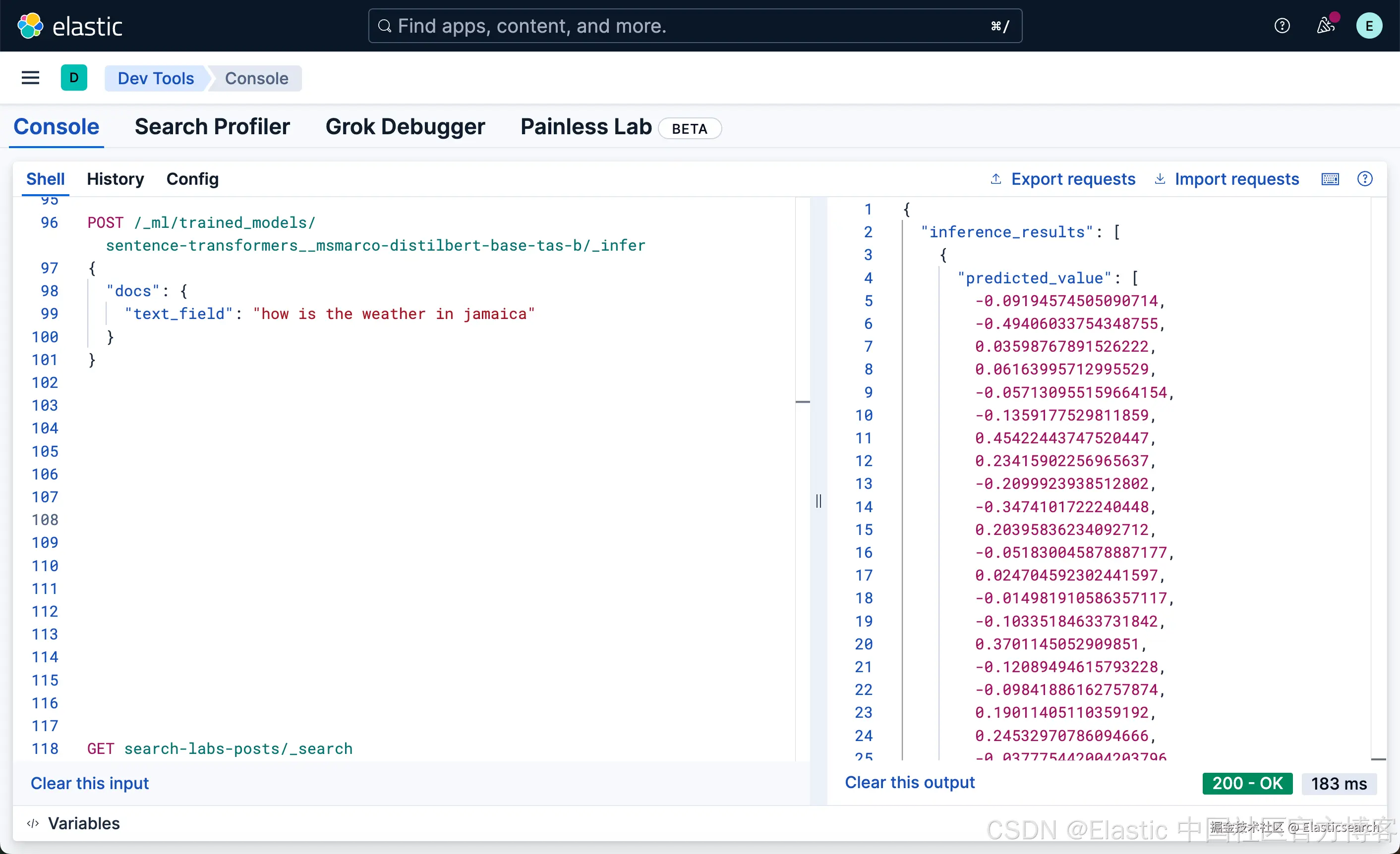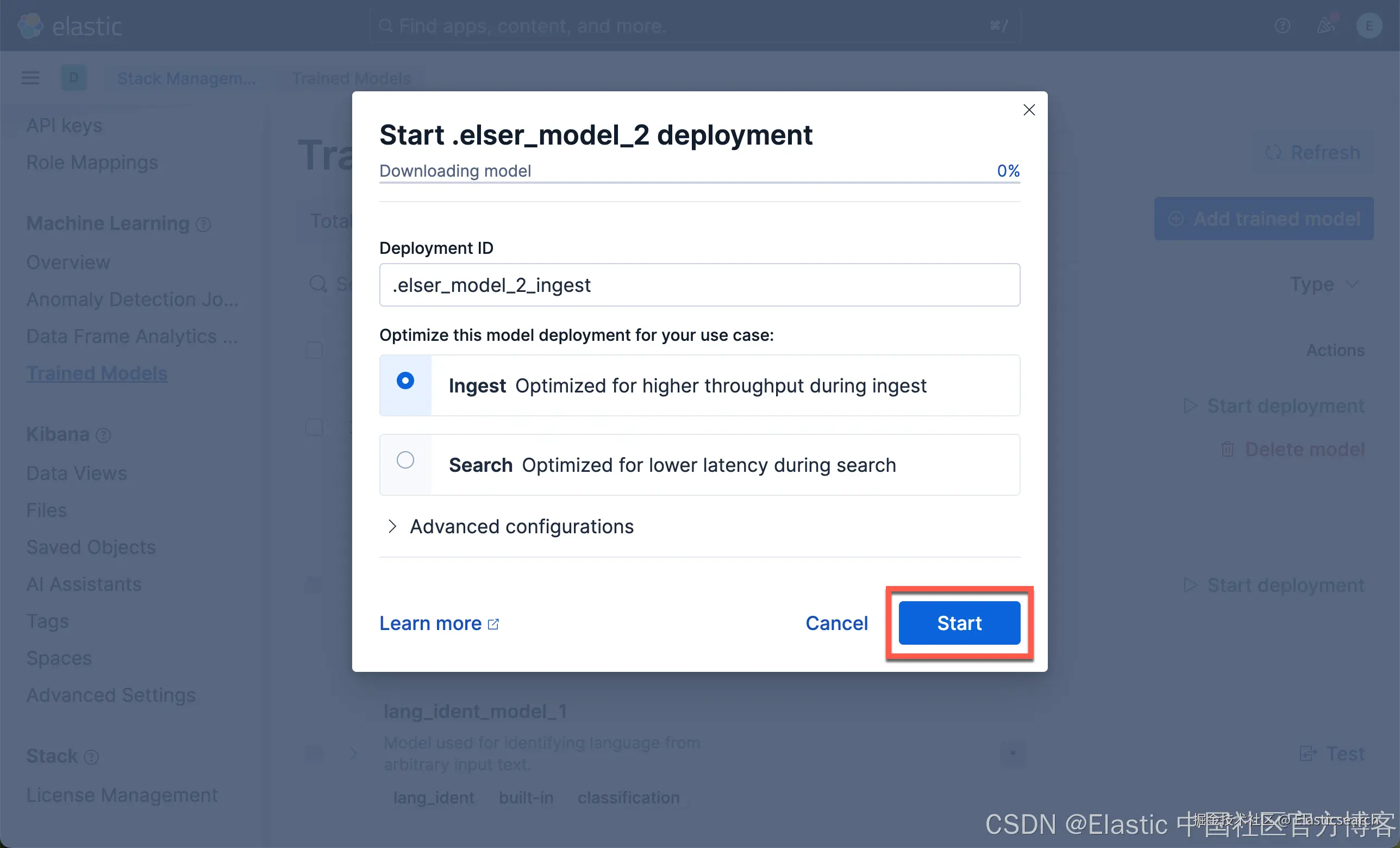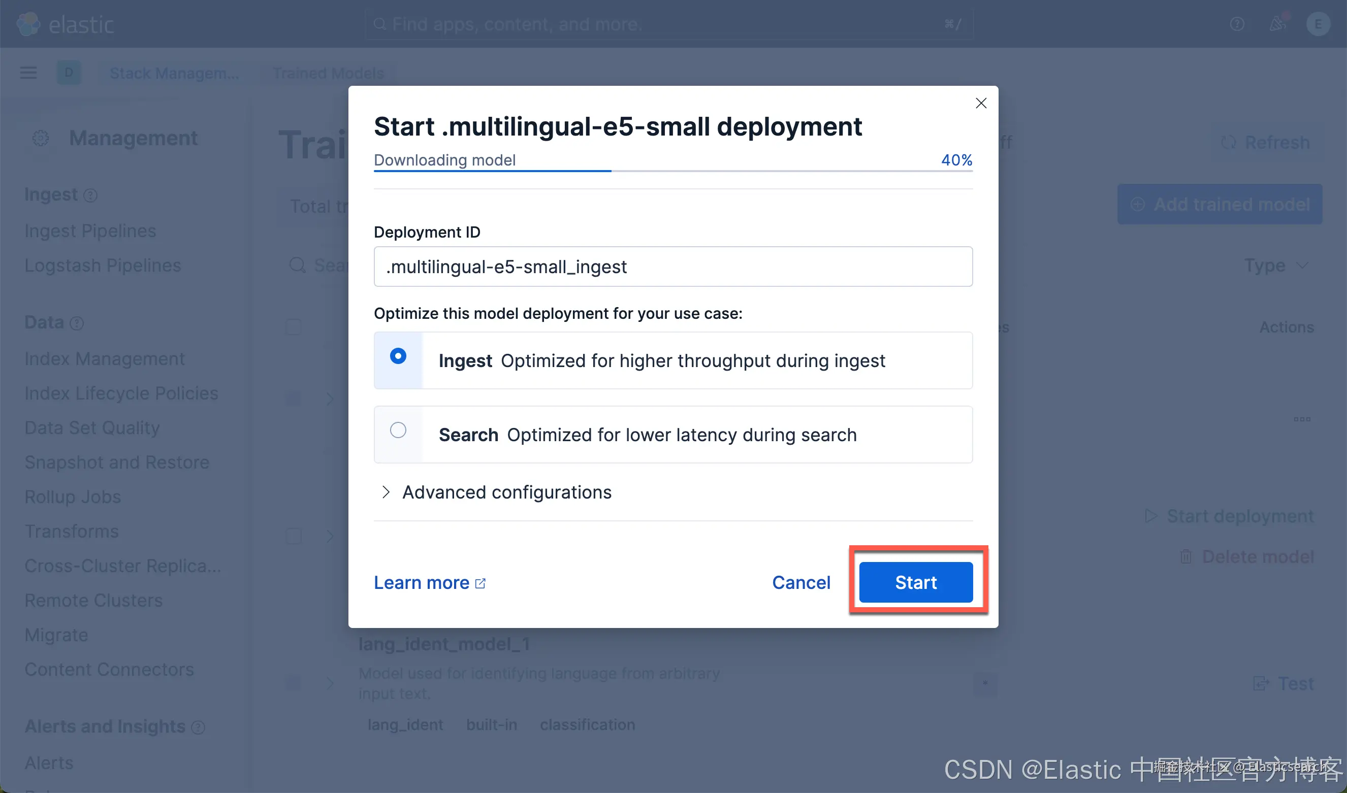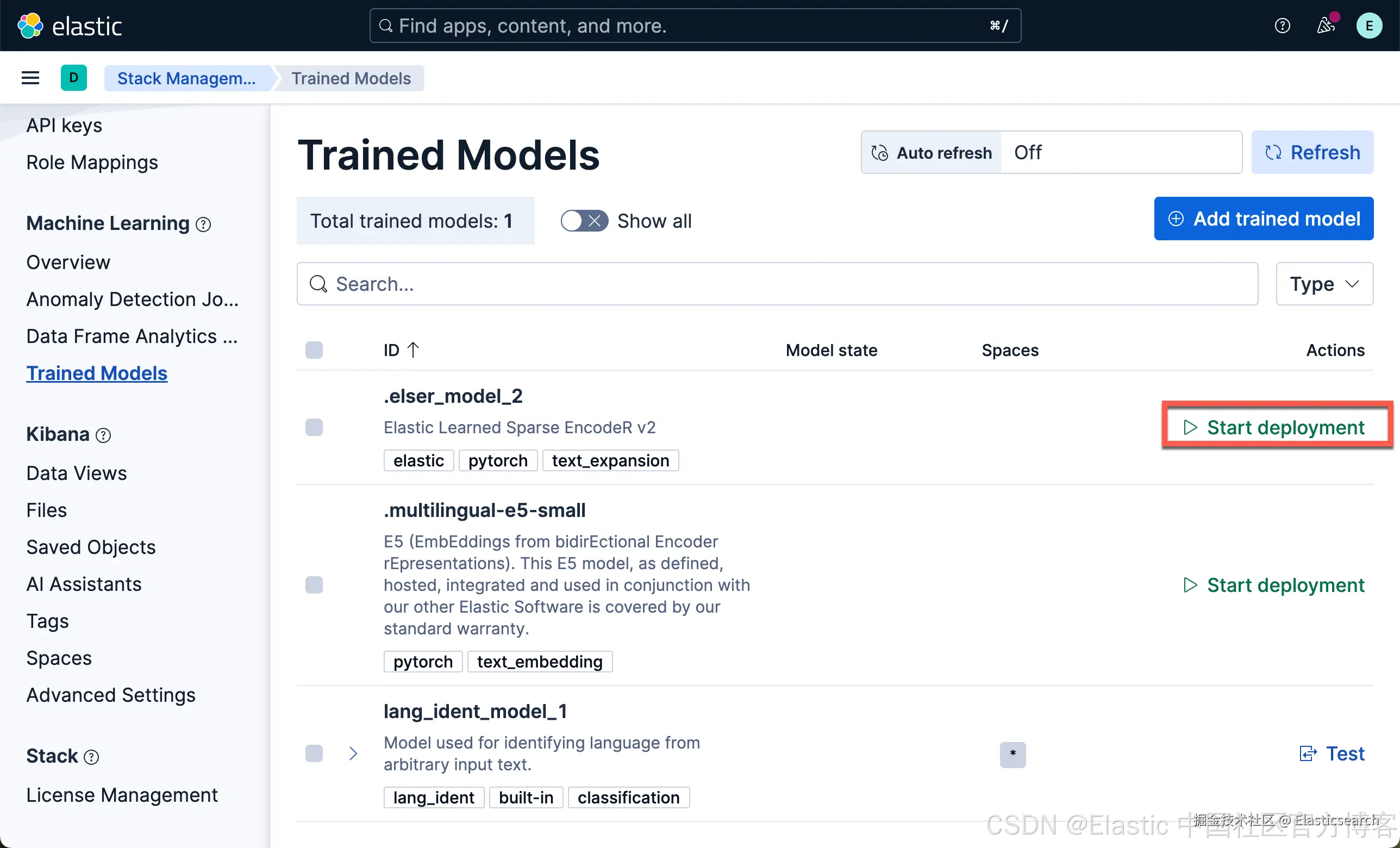 我们可以看到上面的两个模型都已经部署好了。如果你想部署其它的模型,可以参考文章 "Elasticsearch:如何部署 NLP:文本嵌入和向量搜索" 使用 eland 来上传模型。