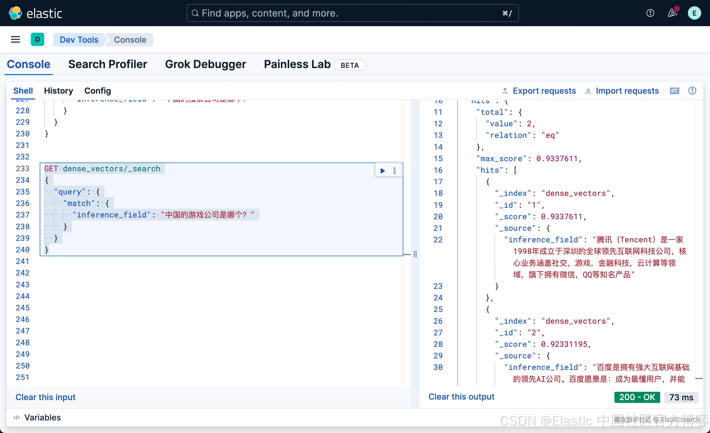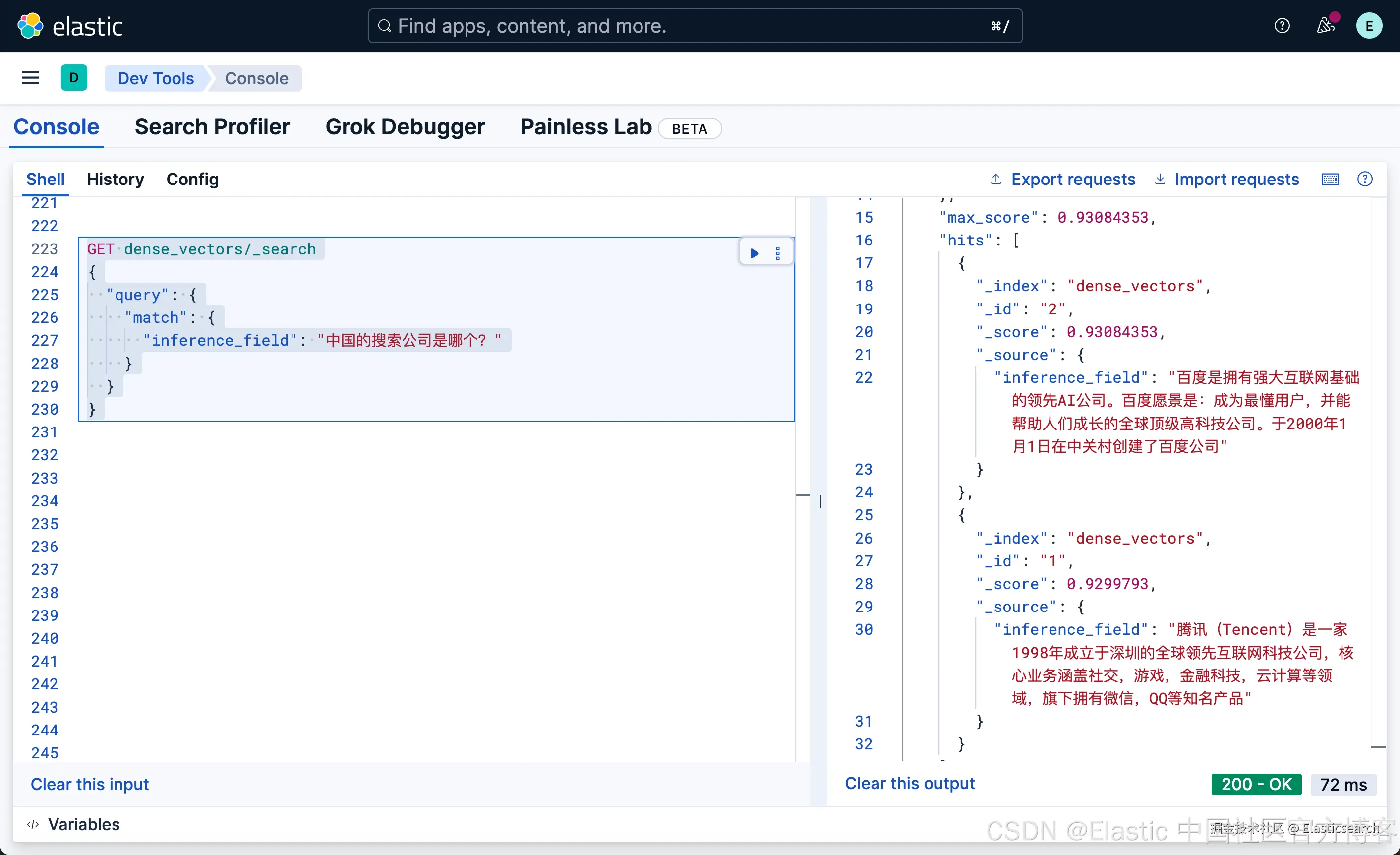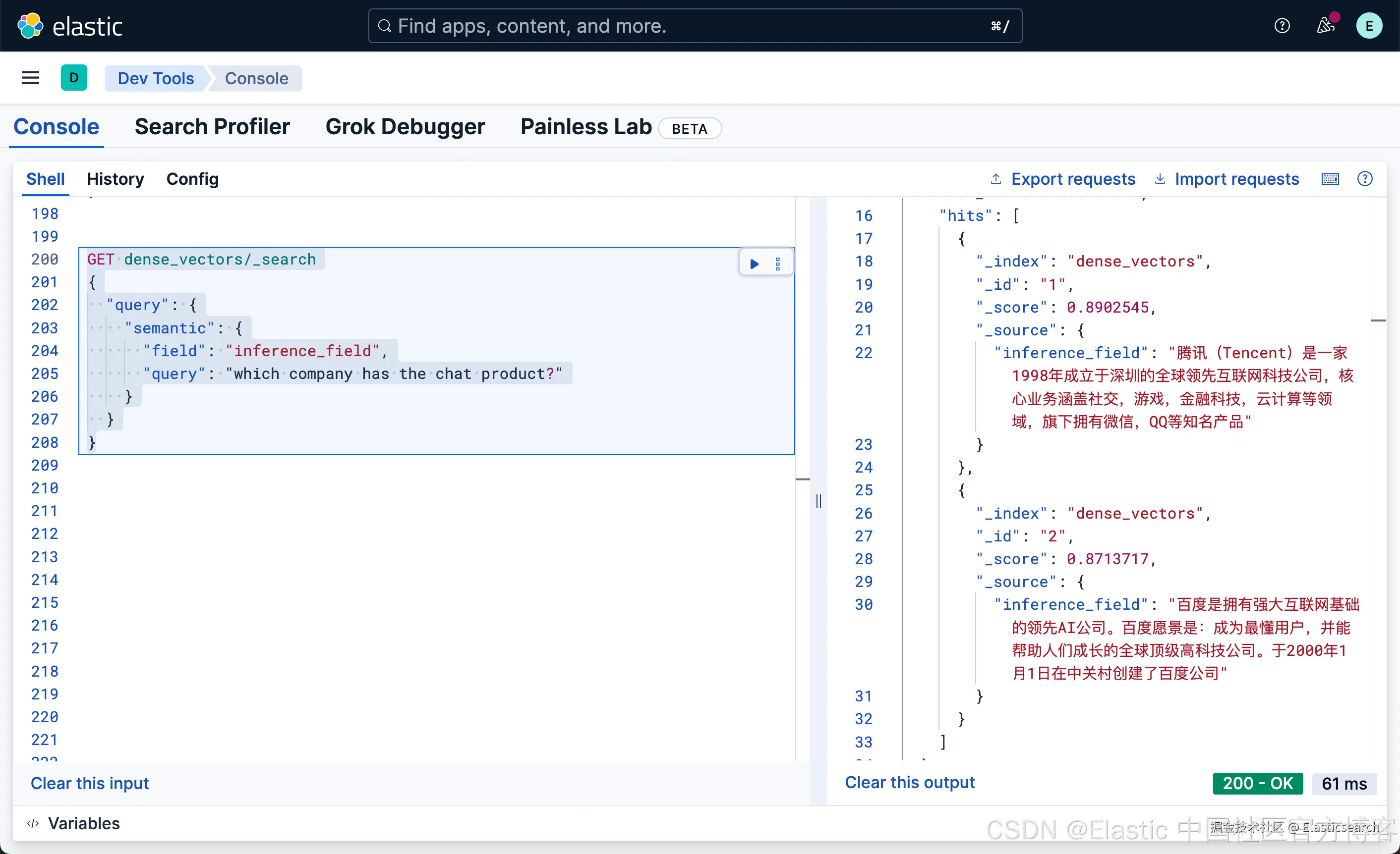 大家如果查看我们的文档,有关百度的文档中 "百度是拥有强大互联网基础的领先AI公司。百度愿景是:成为最懂用户,并能帮助人们成长的全球顶级高科技公司。于2000年1月1日在中关村创建了百度公司 ",它并不含有任何的搜索关键词,但是我们提问 "中国的搜索公司是哪个",百度的结果排名为第一。这个也许就是语义搜索的魅力吧!