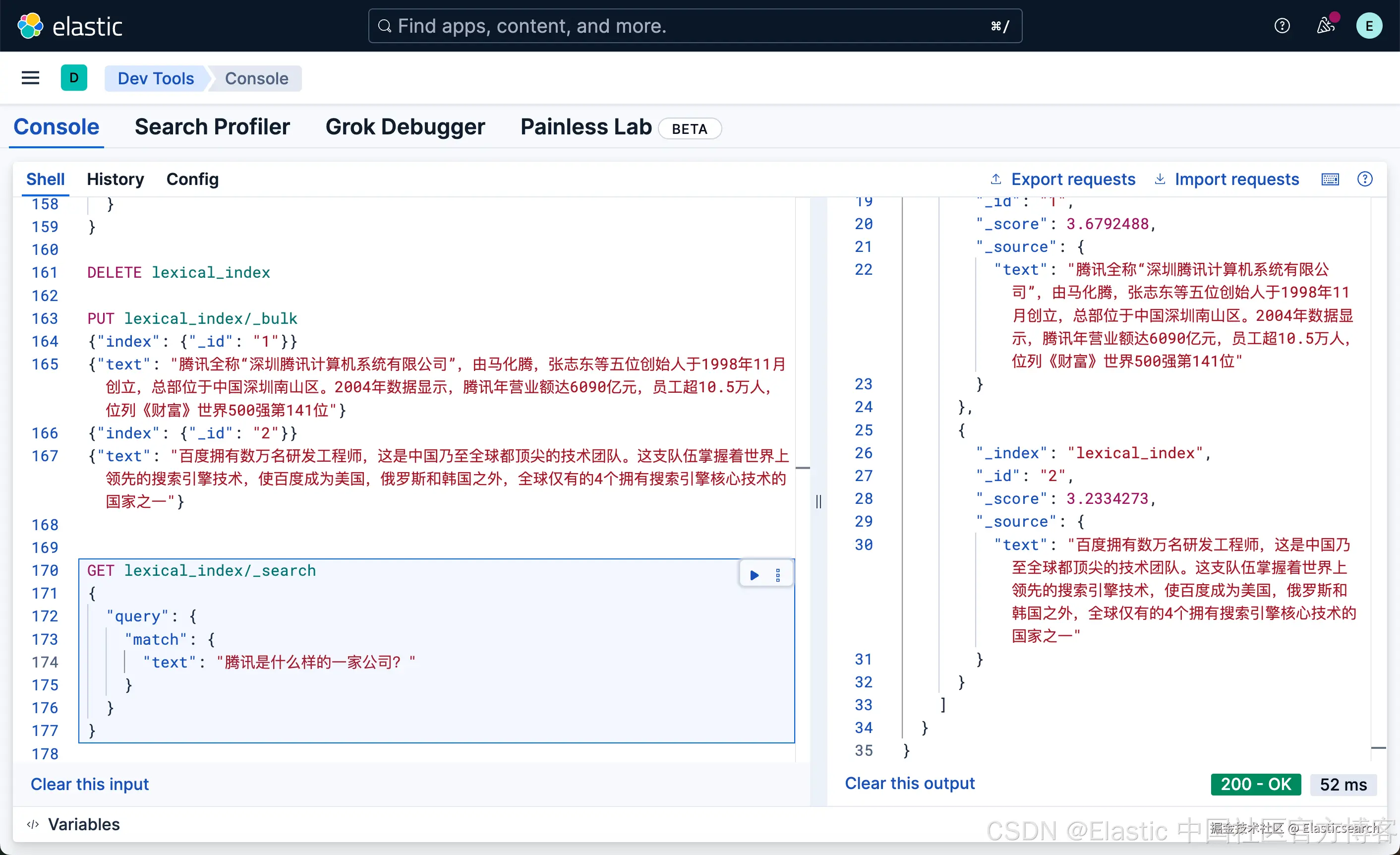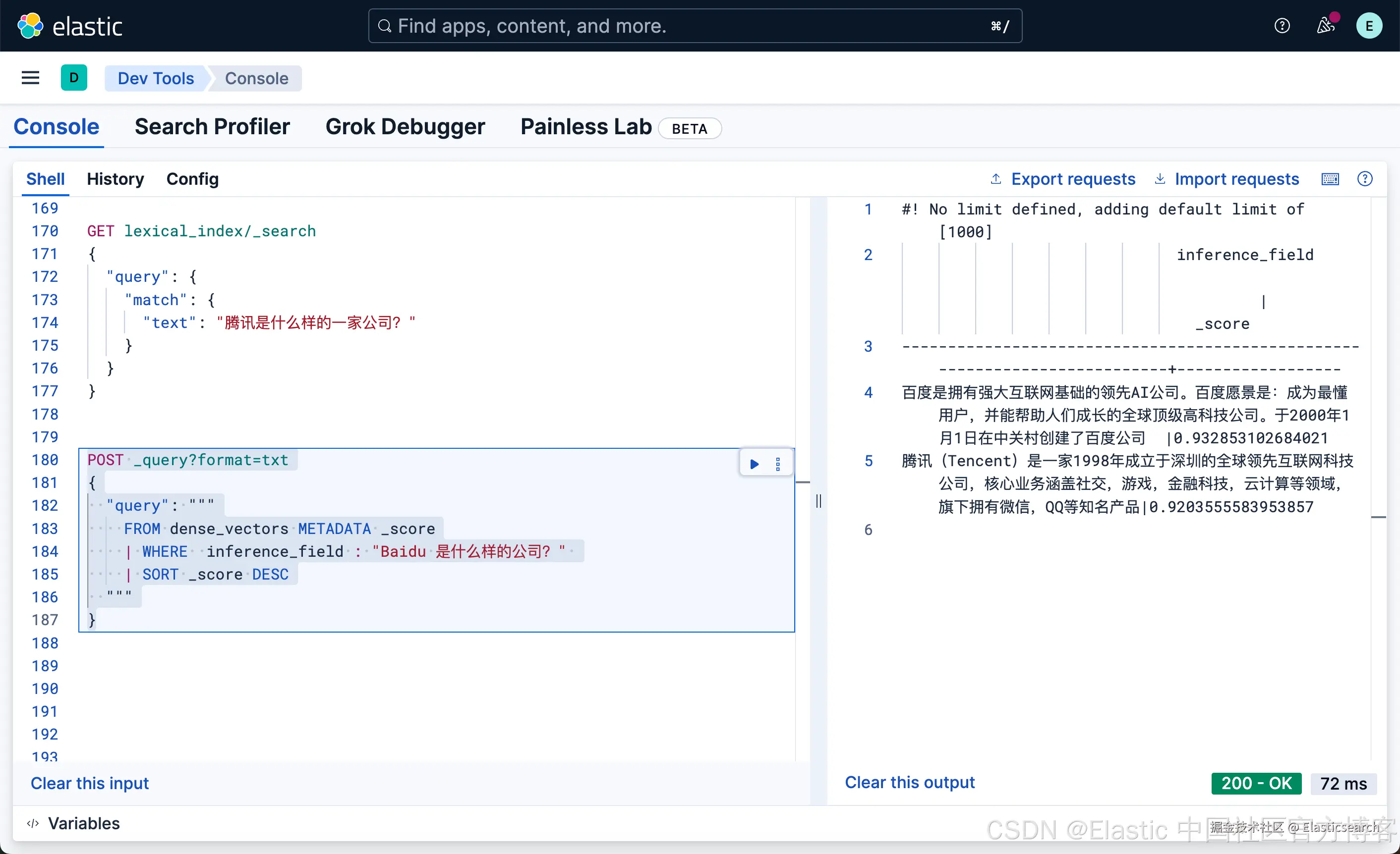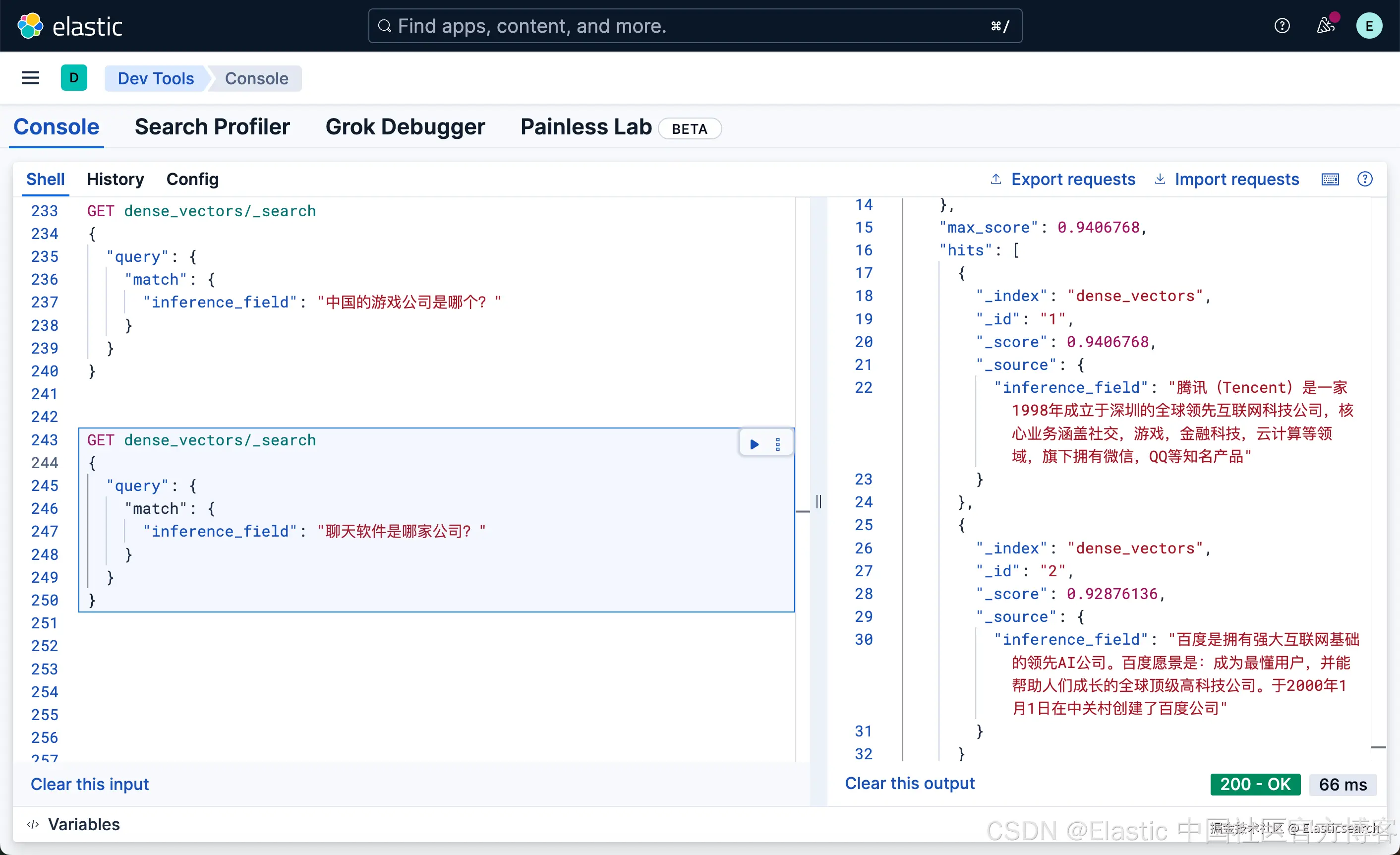 大家如果查看我们的文档,有关百度的文档中 "百度是拥有强大互联网基础的领先AI公司。百度愿景是:成为最懂用户,并能帮助人们成长的全球顶级高科技公司。于2000年1月1日在中关村创建了百度公司 ",它并不含有任何的搜索关键词,但是我们提问 "中国的搜索公司是哪个",百度的结果排名为第一。这个也许就是语义搜索的魅力吧!