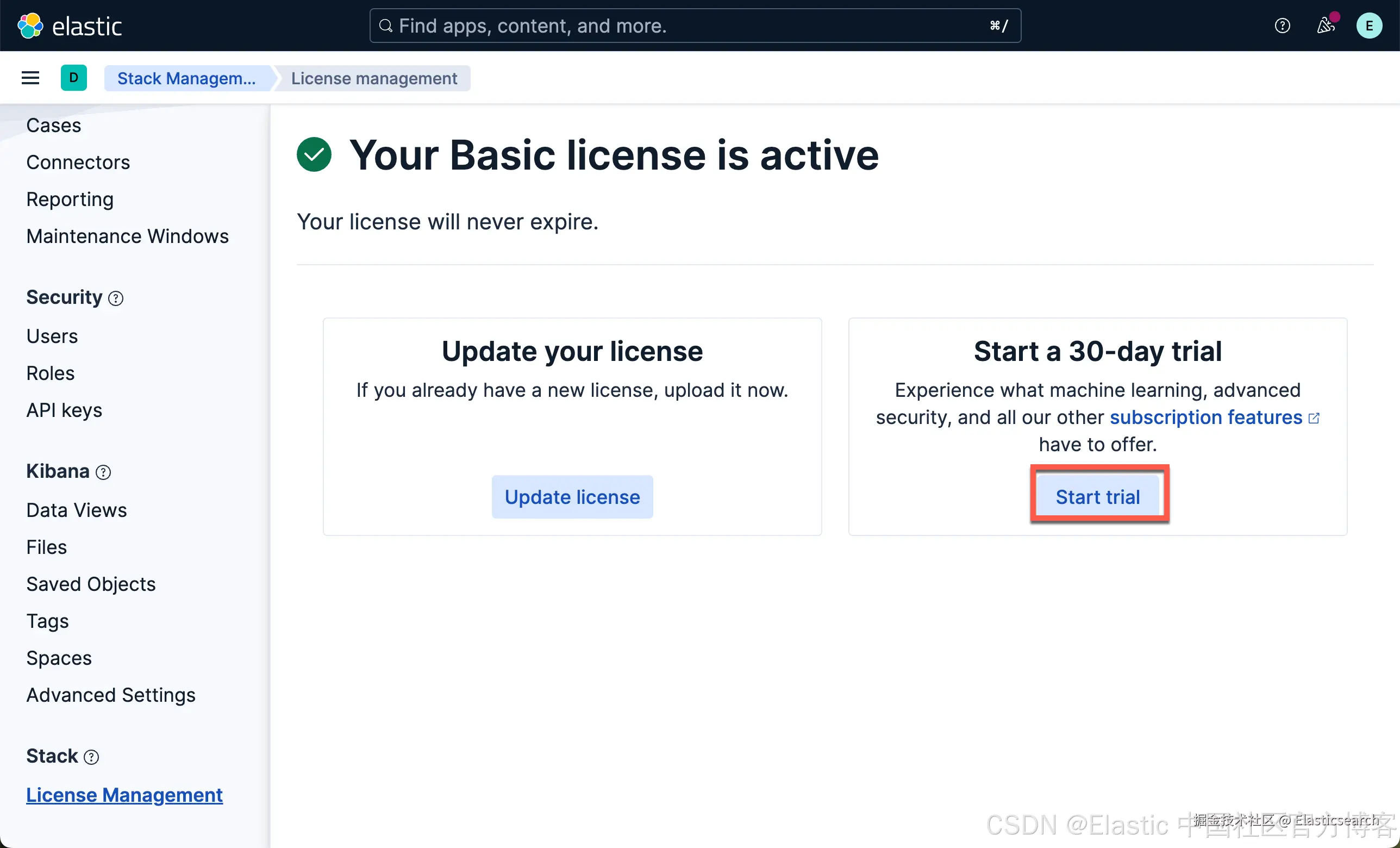 在我们如下的练习中,我们将下载 Elastic 自带的模型:ELSER(稀疏向量) 及 E5(密集向量)。由于这两个嵌入模型是安装在 Elasticsearch 的机器学习节点上的,我们需要启动白金试用。特别值得指出的是:如果你不使用 Elasticsearch 机器学习节点来向量化你的语料,那么你不必启动白金试用。你可以在 Python 代码里实现数据的向量化,或者使用第三方的端点来进行向量化,而只把 Elasticsearch 当做一个向量数据库来使用!
