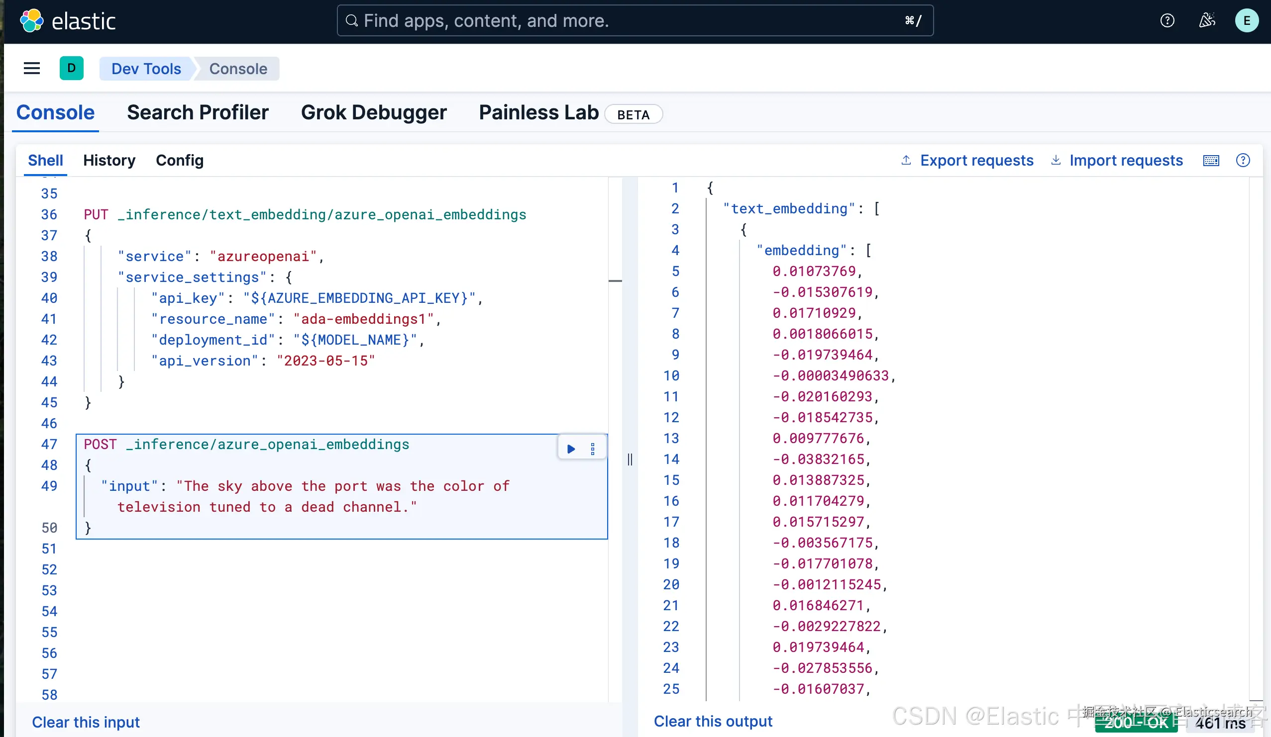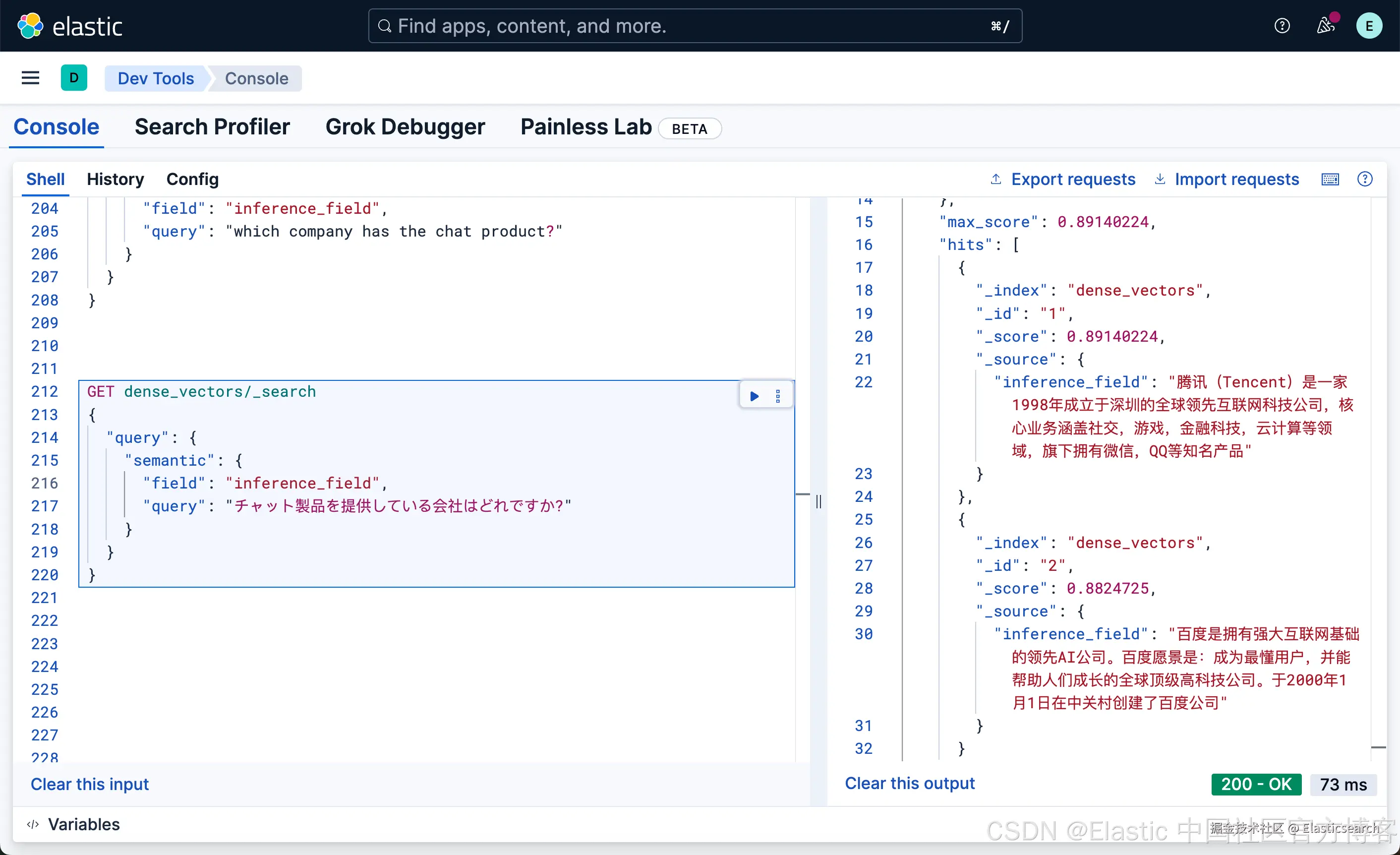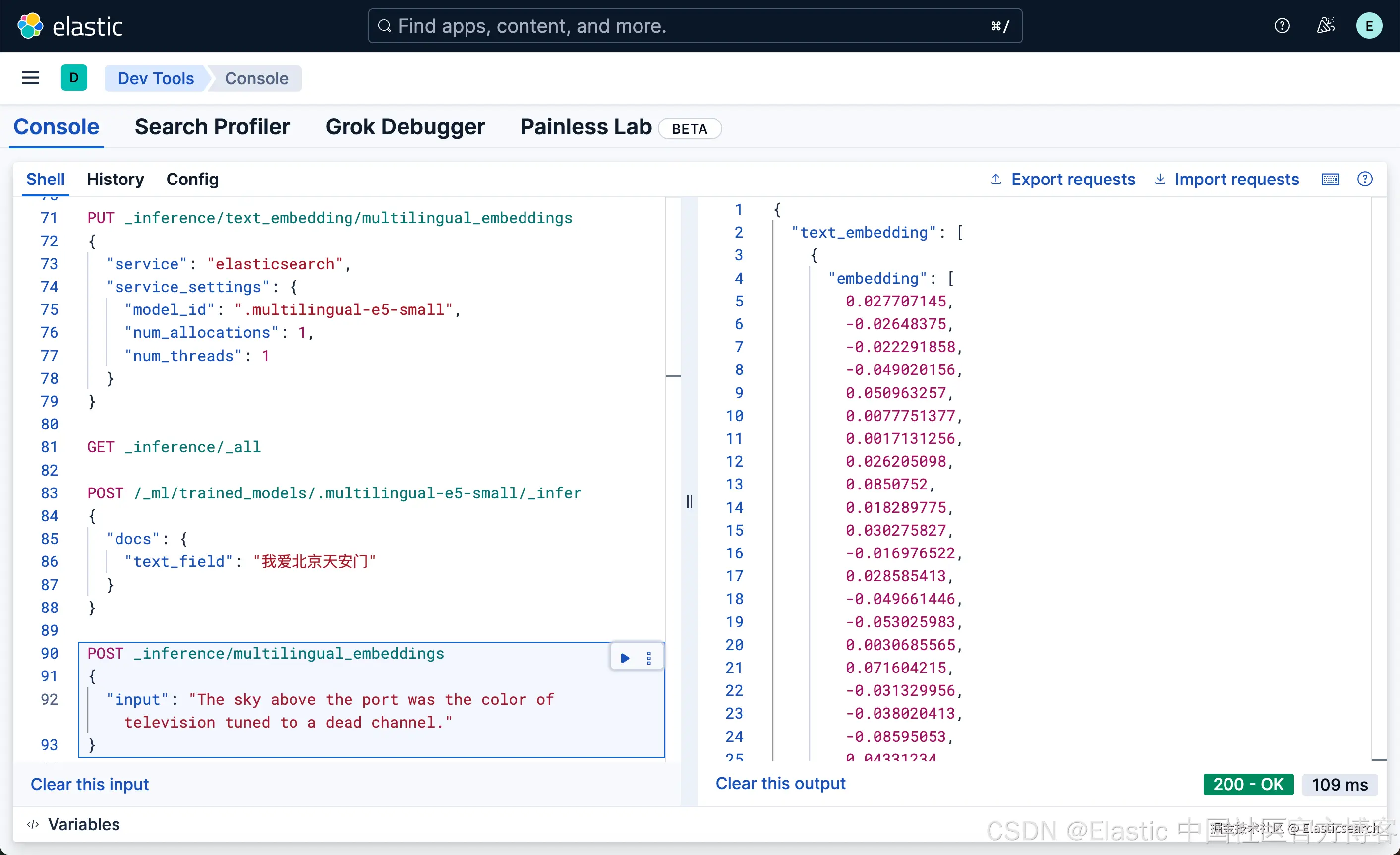 在上面,我们创建了一个叫做 multilingual_embeddings 的 endpoint。如果不是特别要求,我们可以使用系统为我们提供的 .multilingual-e5-small-elasticsearch 端点。