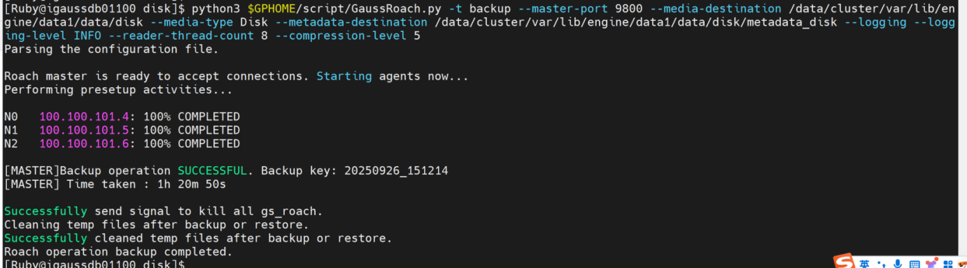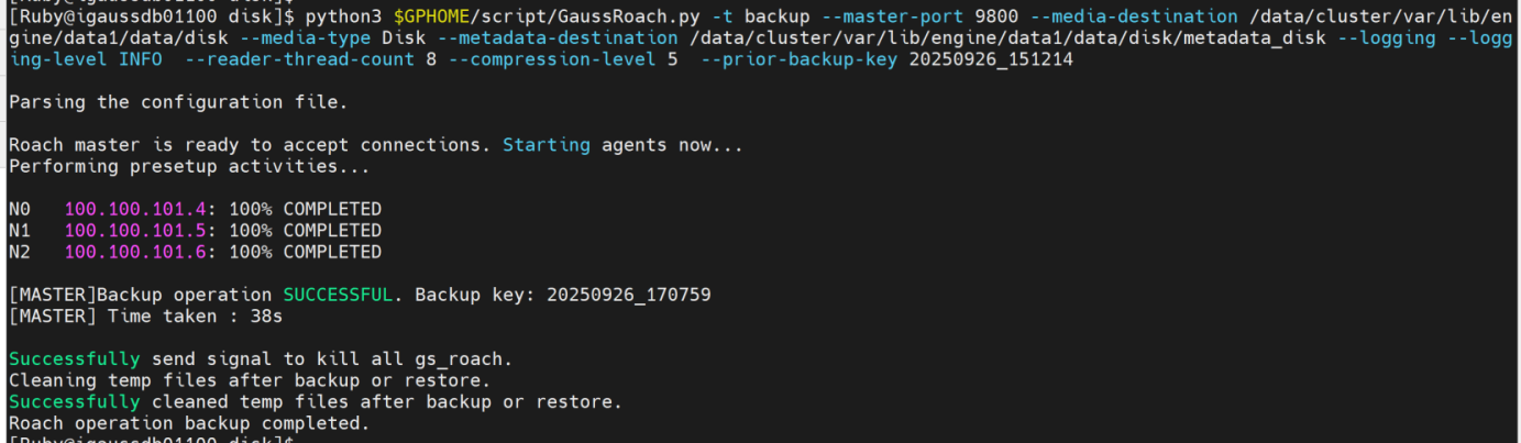 python3 $GPHOME/script/GaussRoach.py -t backup --master-port 9800 --media-destination /data/cluster/var/lib/engine/data1/data/disk --media-type Disk --metadata-destination /data/cluster/var/lib/engine/data1/data/disk/metadata_disk --logging --logging-level INFO --reader-thread-count 8 --compression-level 5 --prior-backup-key 20250926_151214