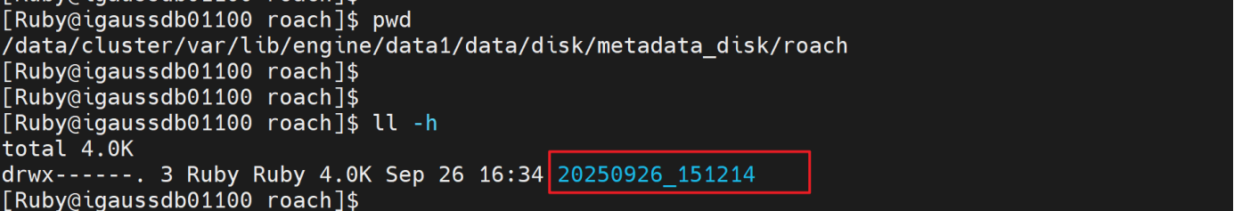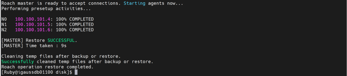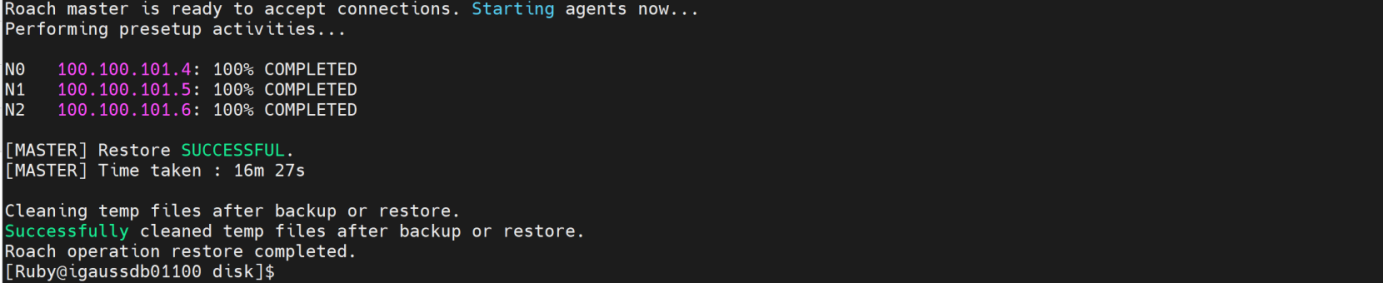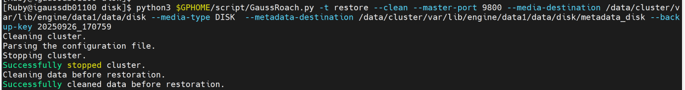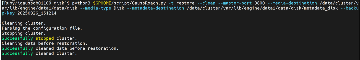 python3 $GPHOME/script/GaussRoach.py -t restore --clean --master-port 9800 --media-destination /data/cluster/var/lib/engine/data1/data/disk --media-type DISK --metadata-destination /data/cluster/var/lib/engine/data1/data/disk/metadata_disk --backup-key 20250926_170759