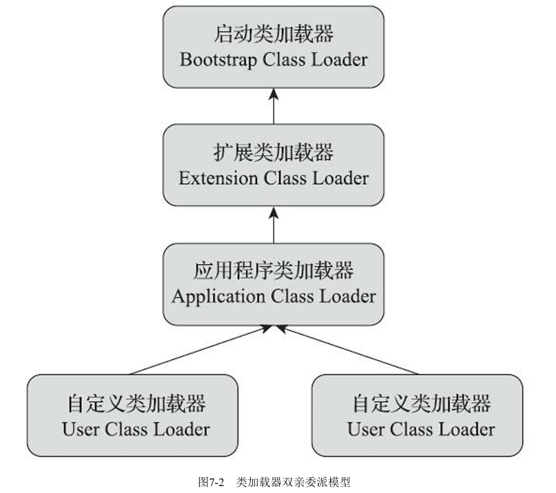 :如果一个类加载器收到了类加载的请求,它首先不会自己去尝试加载这个类,而是把这个请求委派给父类加载器去完成,每一个层次的类加载器都是如此,因此所有的加载请求最终都应该传送到最顶层的启动类加载器中,只有当父加载器反馈自己无法完成这个加载请求(** 它的搜索范围中没有找到所需的类**)时,子加载器才会尝试自己去完成加载。