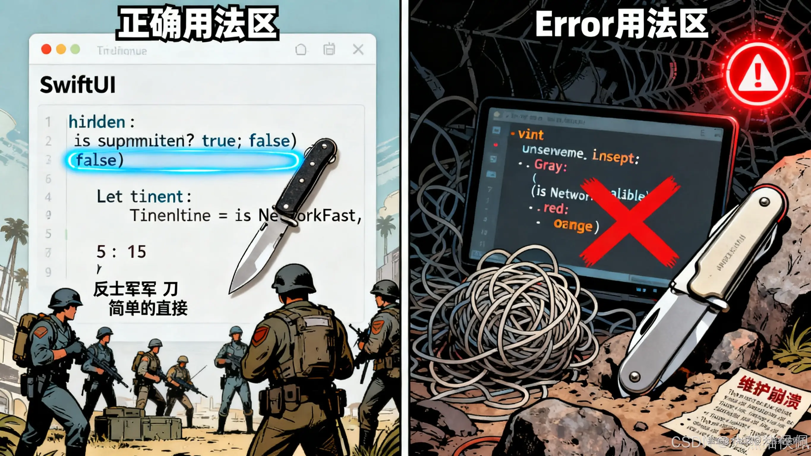 对比之下,三元运算符就像 "浓缩营养液"------ 同样的功能,它只用一行,还不用额外定义变量,在 SwiftUI 这种需要频繁写 "条件样式" 的场景里,简直是反抗军的 "随身干粮",轻便又顶用。