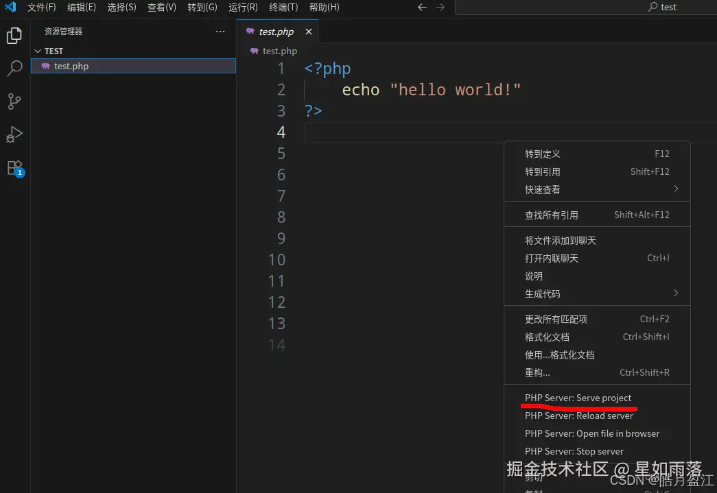 新建test.php文件,编写测试代码,鼠标右键,运行"PHP Server:Server project" 运行成功:
