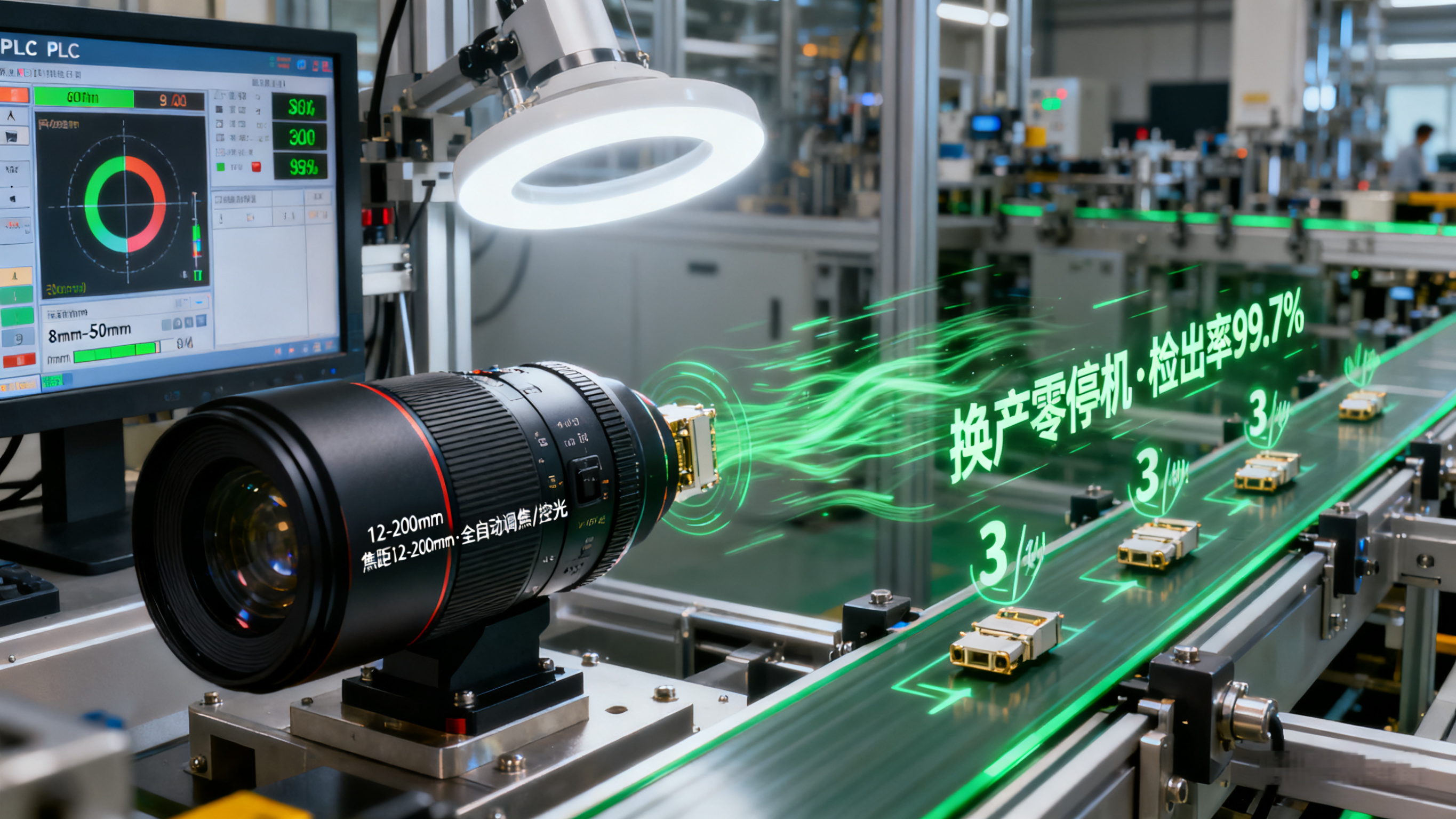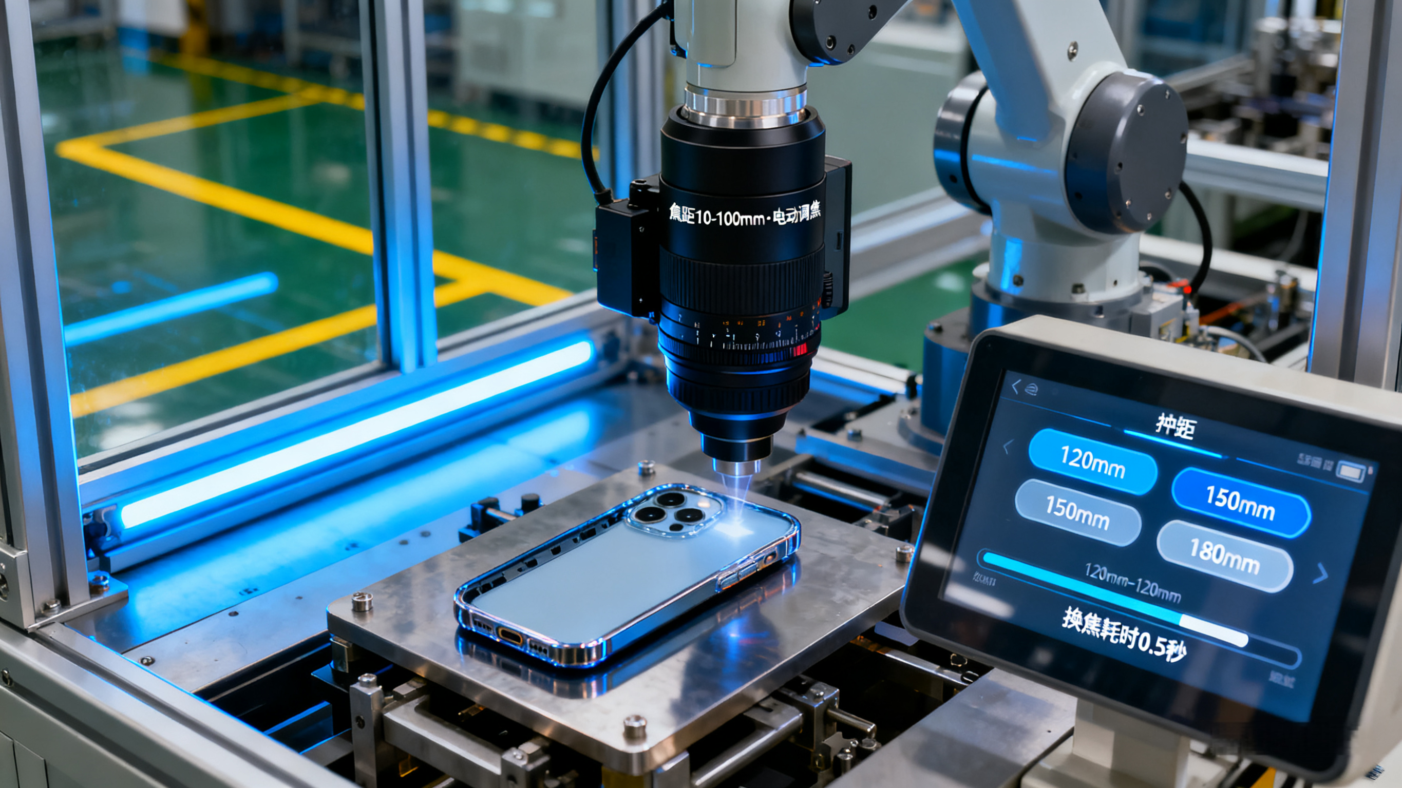 痛点:用手动变焦镜头,换外壳型号时需工人爬进流水线调焦,每次 5 分钟,存在安全隐患;