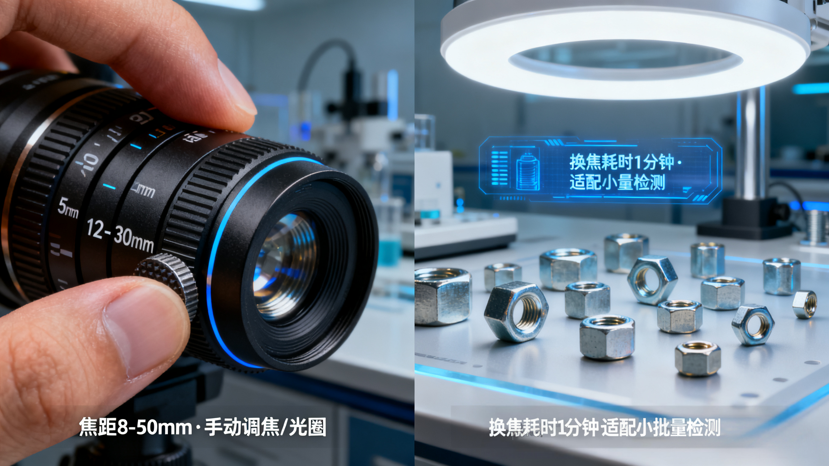 痛点:用定焦镜头需备 4 个焦距,换零件时拆镜头 + 校准,每次 30 分钟,抽检效率低;
