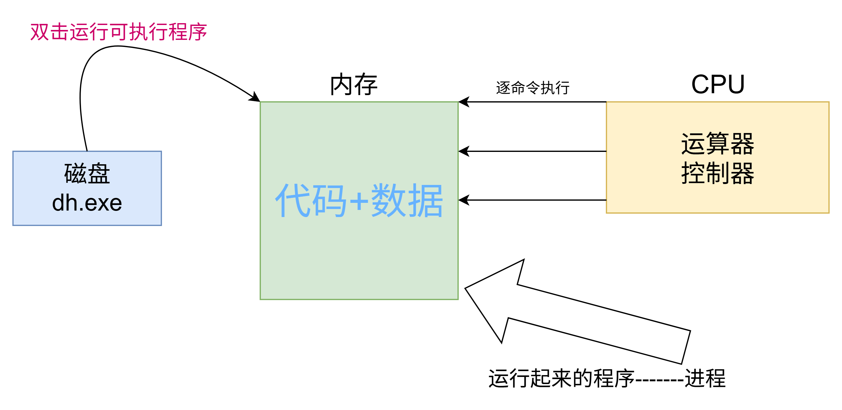 我们都知道,在编写完一段代码后,点击执行时,代码会被编译并链接成一个可执行文件。这个可执行文件其实是存储在磁盘上的。当我们双击它时,操作系统会将其加载到内存中,因为只有加载到内存中,CPU 才能逐条指令地执行(这也是冯诺依曼体系中描述的执行原理)。不过,值得注意的是,一旦可执行程序加载到内存中,它就不再是简单的"程序"了,严格来说,它已经成为一个"进程"------这是程序在内存中的动态表现。