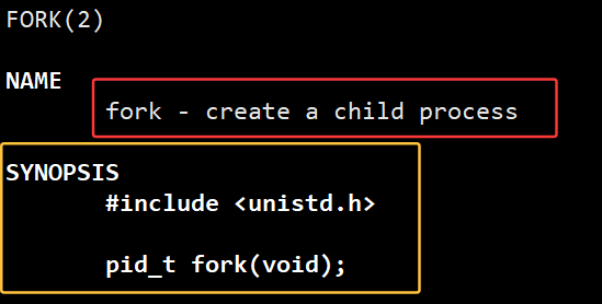 中;返回类型pid_t,它定义的遍历是进程号类型;fork创建成功会给子进程返回0,然后给父进程返回PID;创建失败则会返回一个<1的数给父进程。