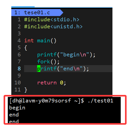 这行会首先输出 begin。无论是父进程还是子进程,它们都会执行到这一行,因此你会看到 begin 输出一次。