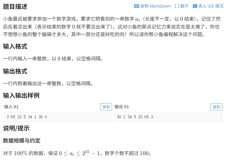 这道题目要求我们读取一串以0结尾的数字序列,然后将其逆序输出(不包括结尾的0)。这是一个典型的数组逆序输出问题,考察对数组操作和输入输出的掌握。