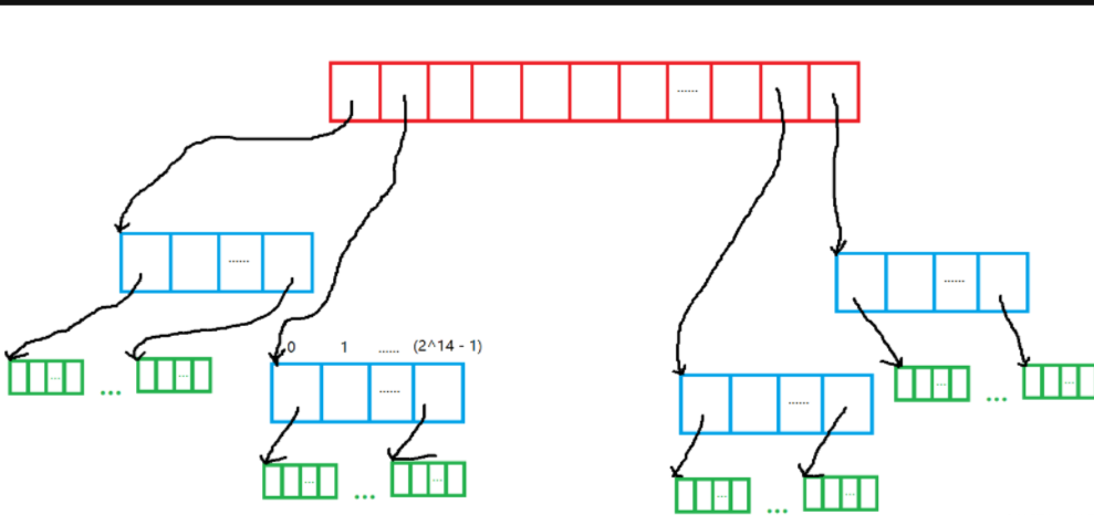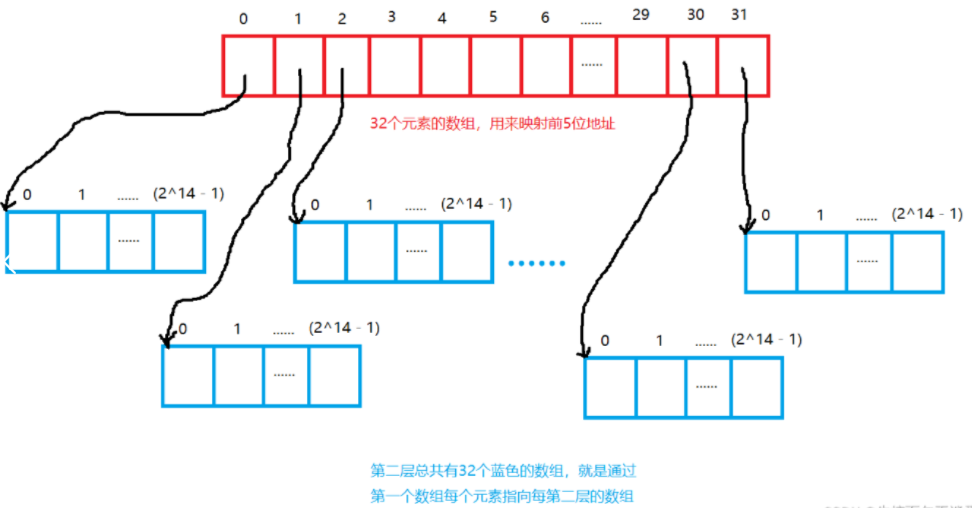 第一层数组(Root) :用页号的最高几位(e.g., 3位)索引,找到对应的"大区"档案柜(第二层数组的指针)。