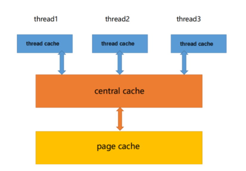 第一层是thread cache ,第二层是central cache,第三层是page cache。