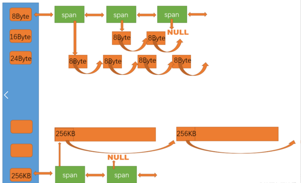 一个进程有几个线程,就会有几个thread-cache(tc),每一个线程都会有对应的tc,一个管理空间的对象,每个线程不需要加锁,因为每一个线程都有属于自己的tc,到自己的tc中去申请空间,单次向tc申请的空间最大位256KB。